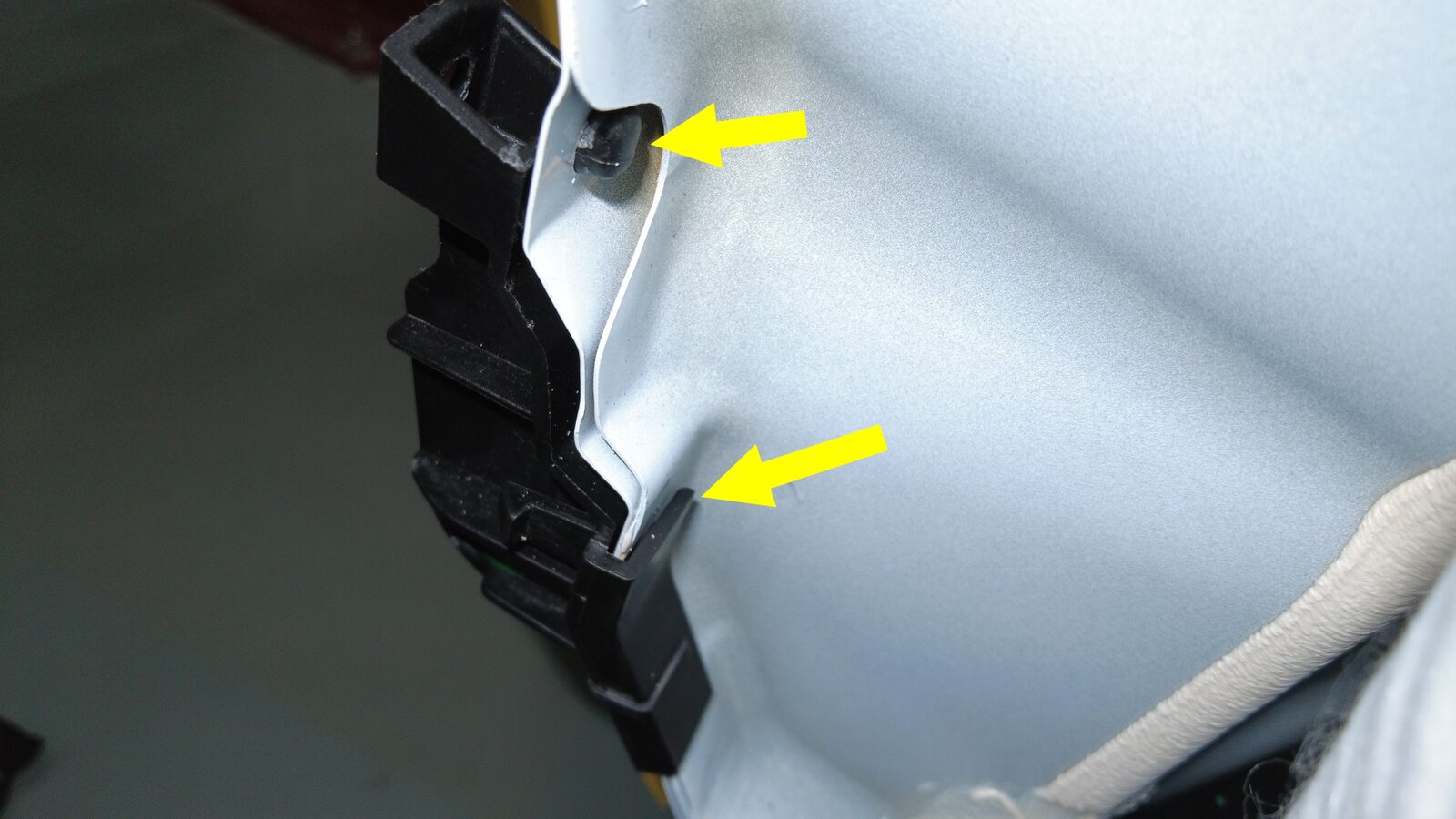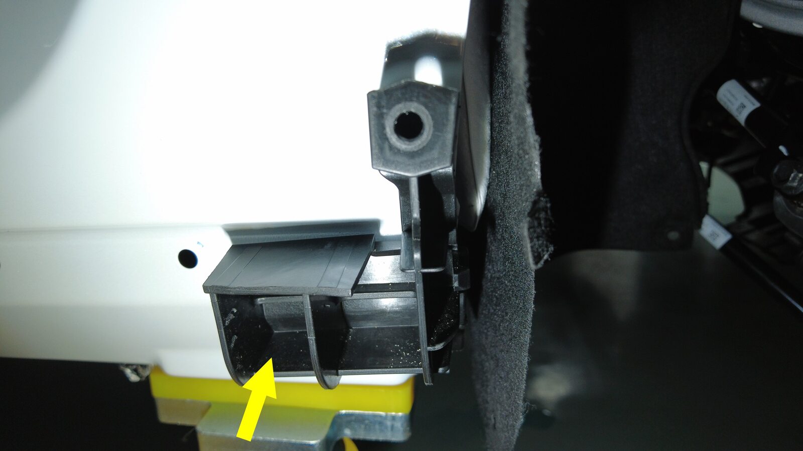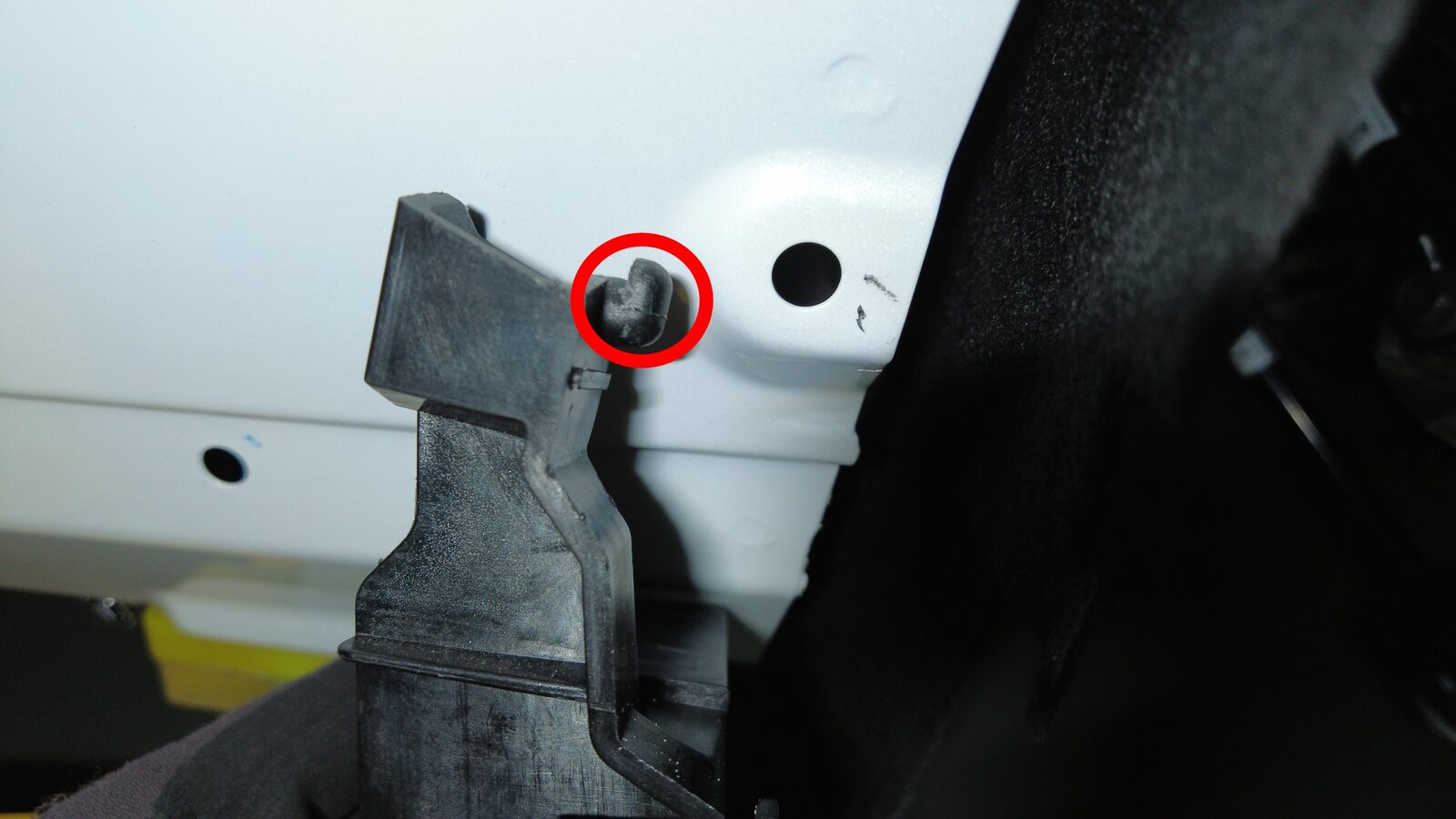 将支架上的锁片与左后翼子板下部的开孔对齐,将支架朝车头方向旋转以使支架边缘与车身接合,然后下压门槛支架,使其紧贴在车身上。