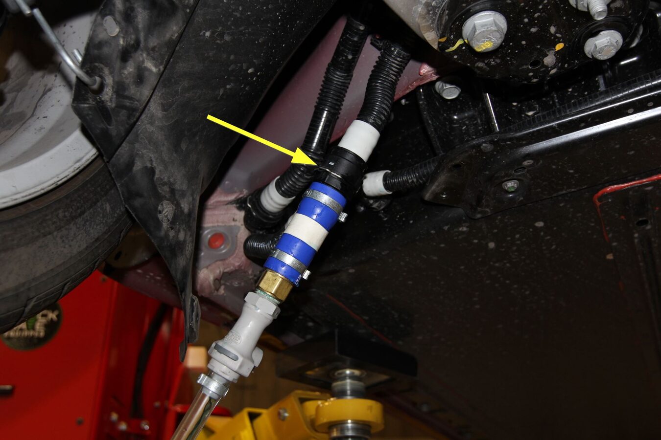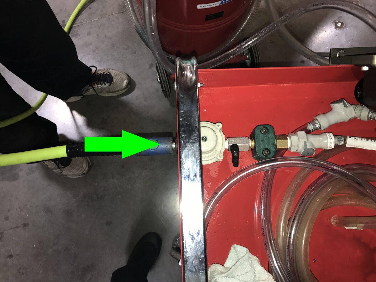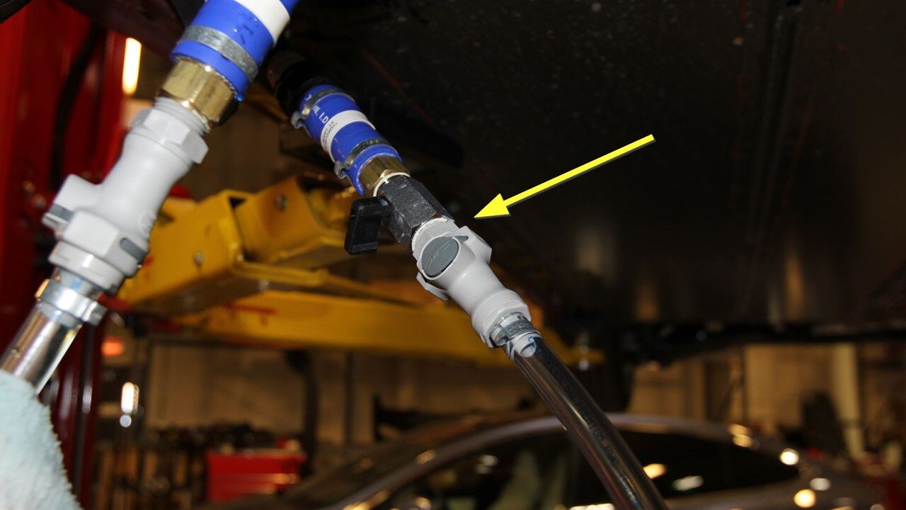 Slowly open valve on pressure regulator and allow coolant to drain out of PT return hose