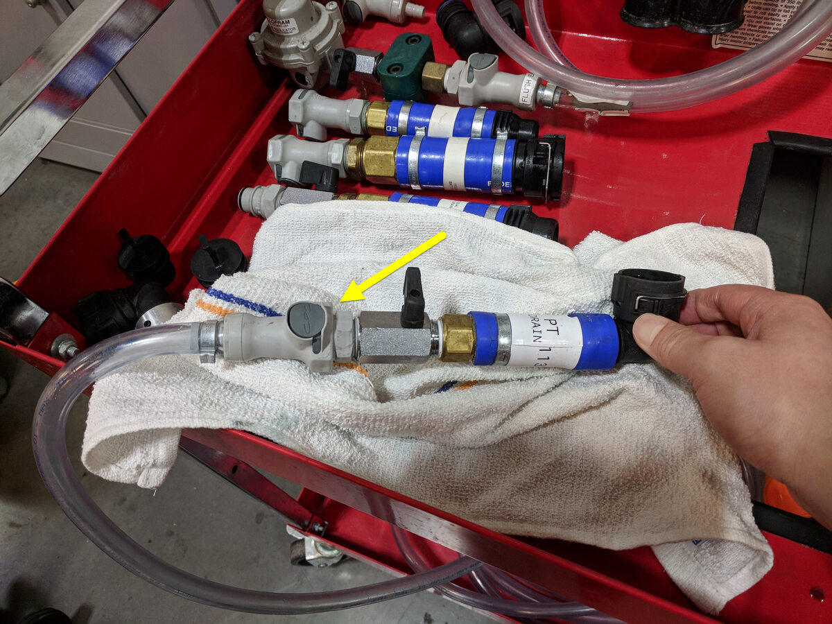 Attach PT drain fitting adapter to coolant pressure tester cart