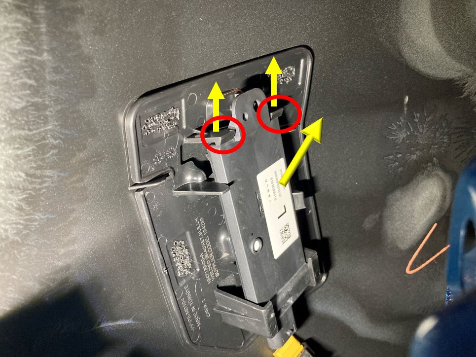 提起锁片(2 个),然后拆下左后低能耗蓝牙 (BLE)。