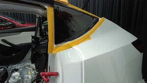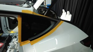 使用遮蔽胶带粘贴 LH 后角窗玻璃周围,以保护车身和车漆。