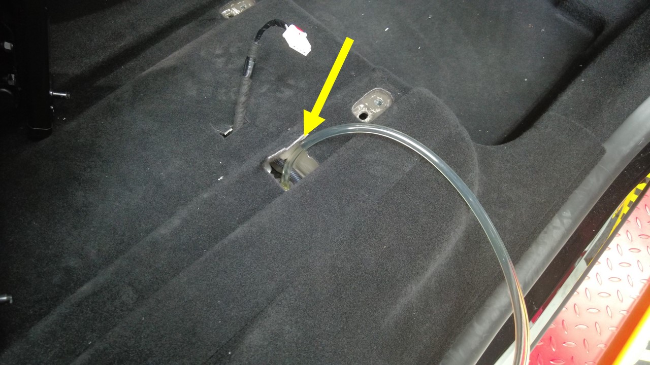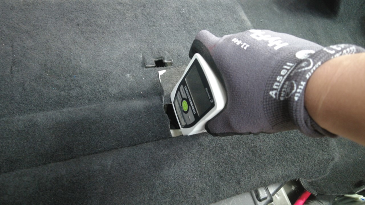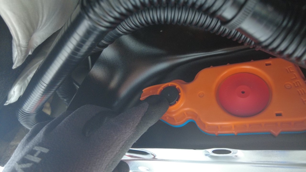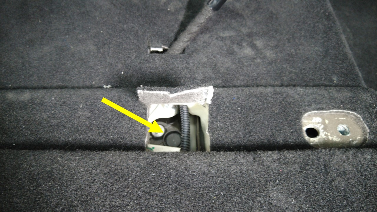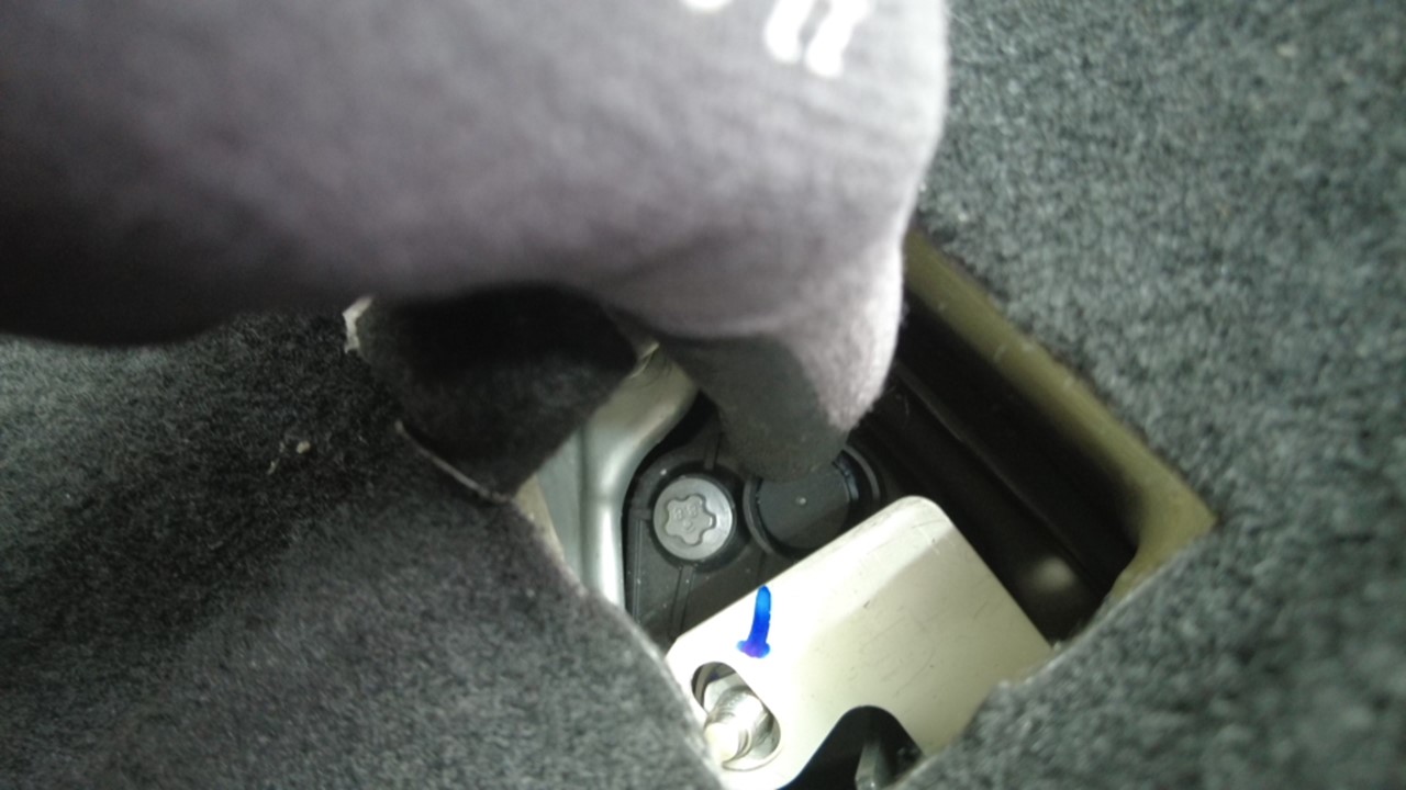 分离第二排右侧座椅下方的地毯开孔,以接触直通型组合通气孔,必要时可进行扩孔。