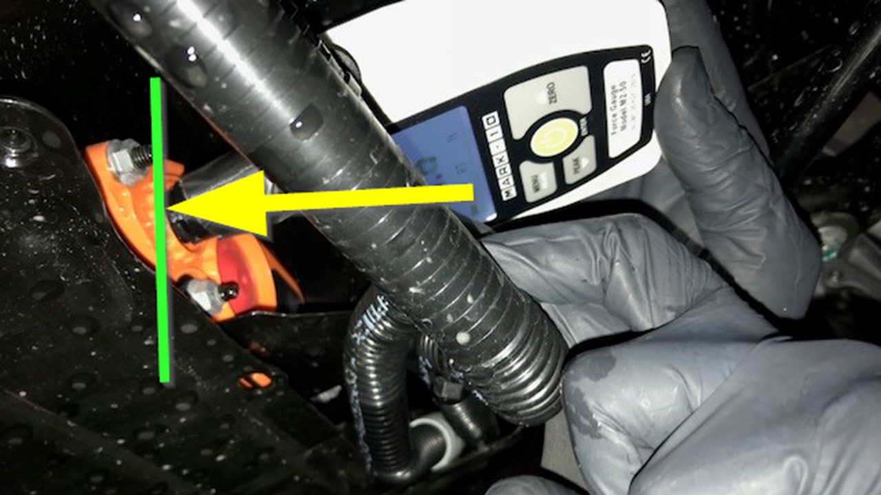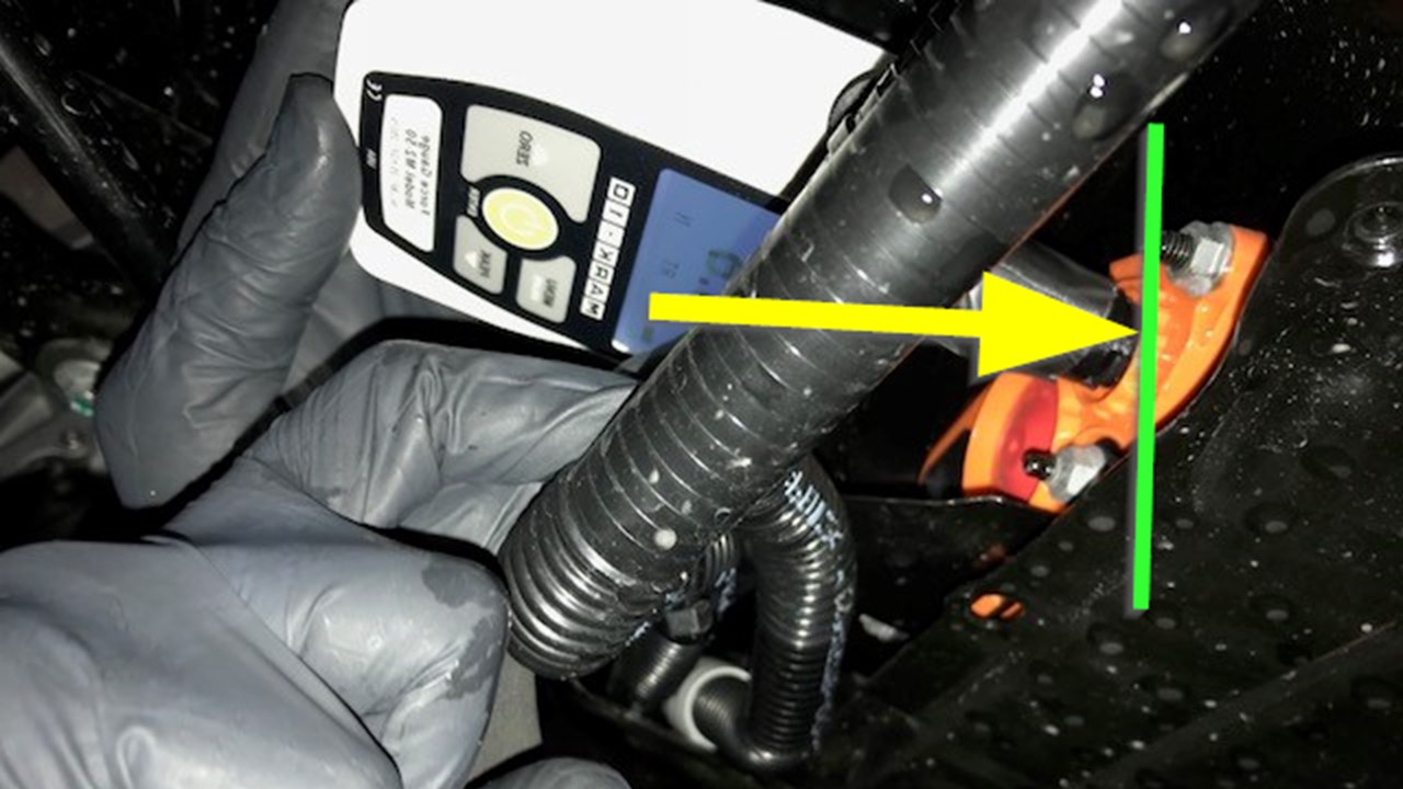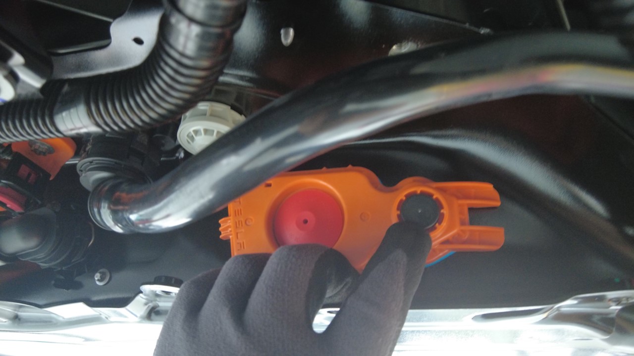 将新的通气孔塞 (1108907-00-B)(2 个)安装到高压电池通风罩总成上。使用 MARK-10 测力计在通风罩上垂直施加 200 N 的作用力。