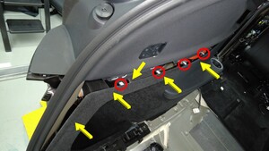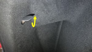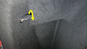 松开将后备箱左侧饰板边缘固定到车辆的卡子(5 个)和定位销,然后小心地向后拉动饰板顶部边缘。