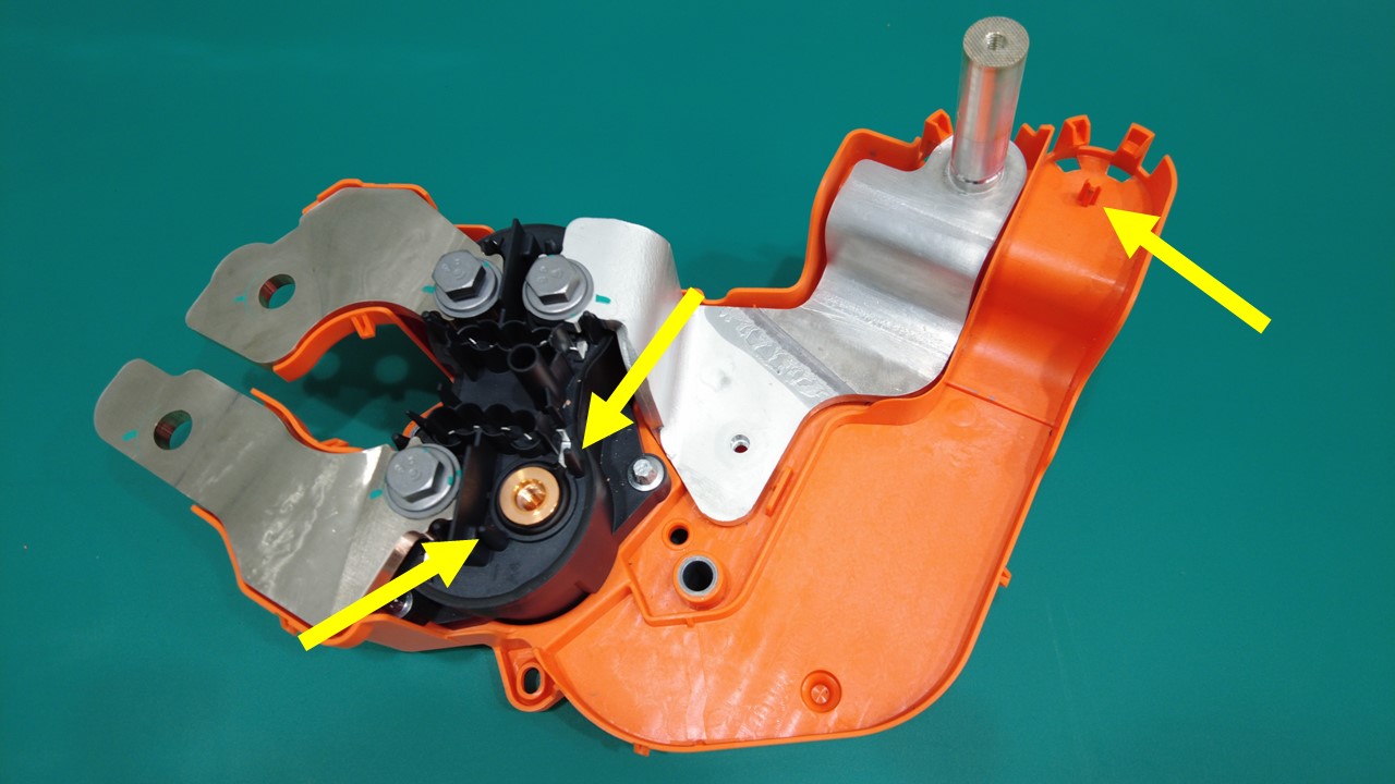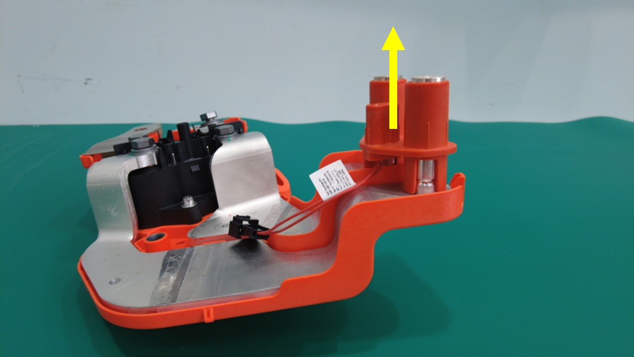 紧固定位销(3 个)和锁片(2 个),然后安装新的螺纹胶螺栓,将负极输入快充母排固定到快充触点开关。