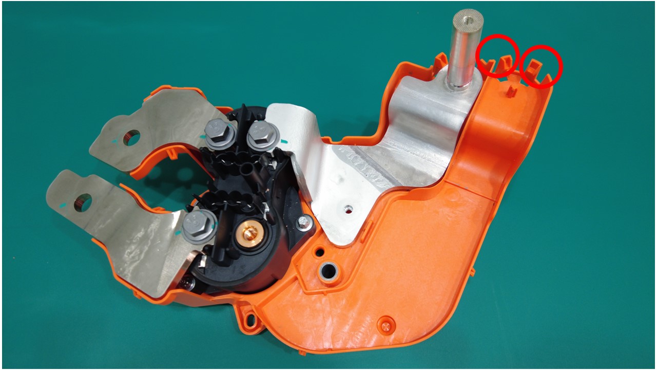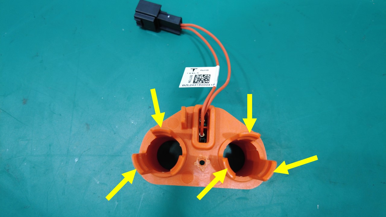 将快充高压支架安装到快充触点开关总成上,确保所有锁片(6 个)均已紧固。