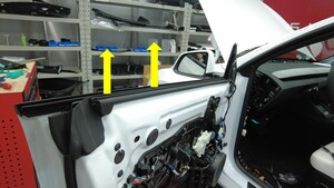 将左前车门内侧密封条向下压入左前车门。