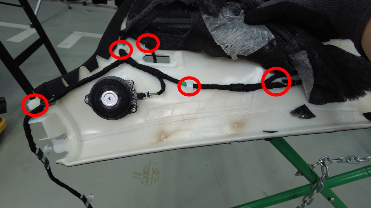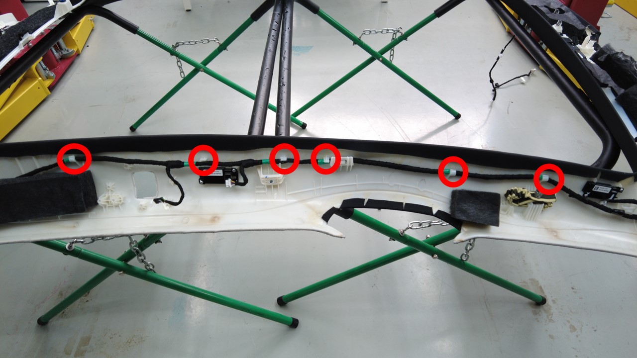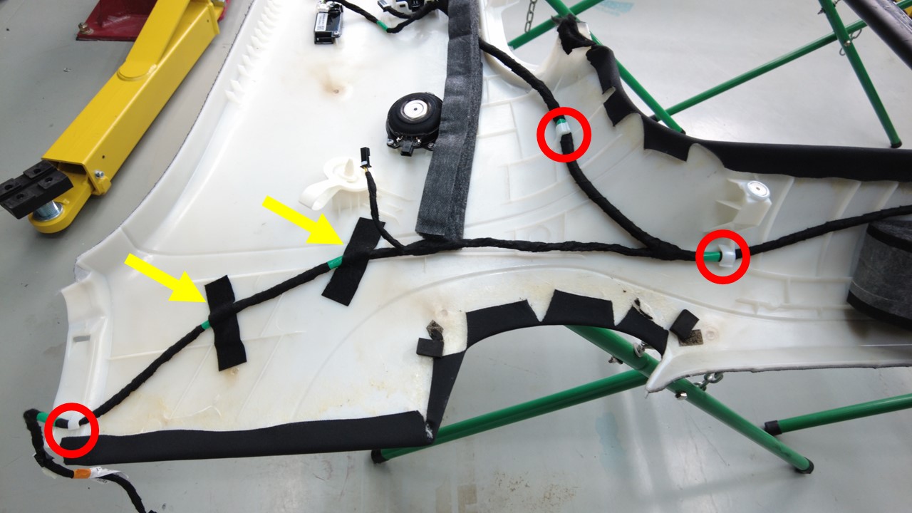 紧固夹子(30 个)并粘贴胶带(3 个),将顶篷线束安装到前部顶篷上。