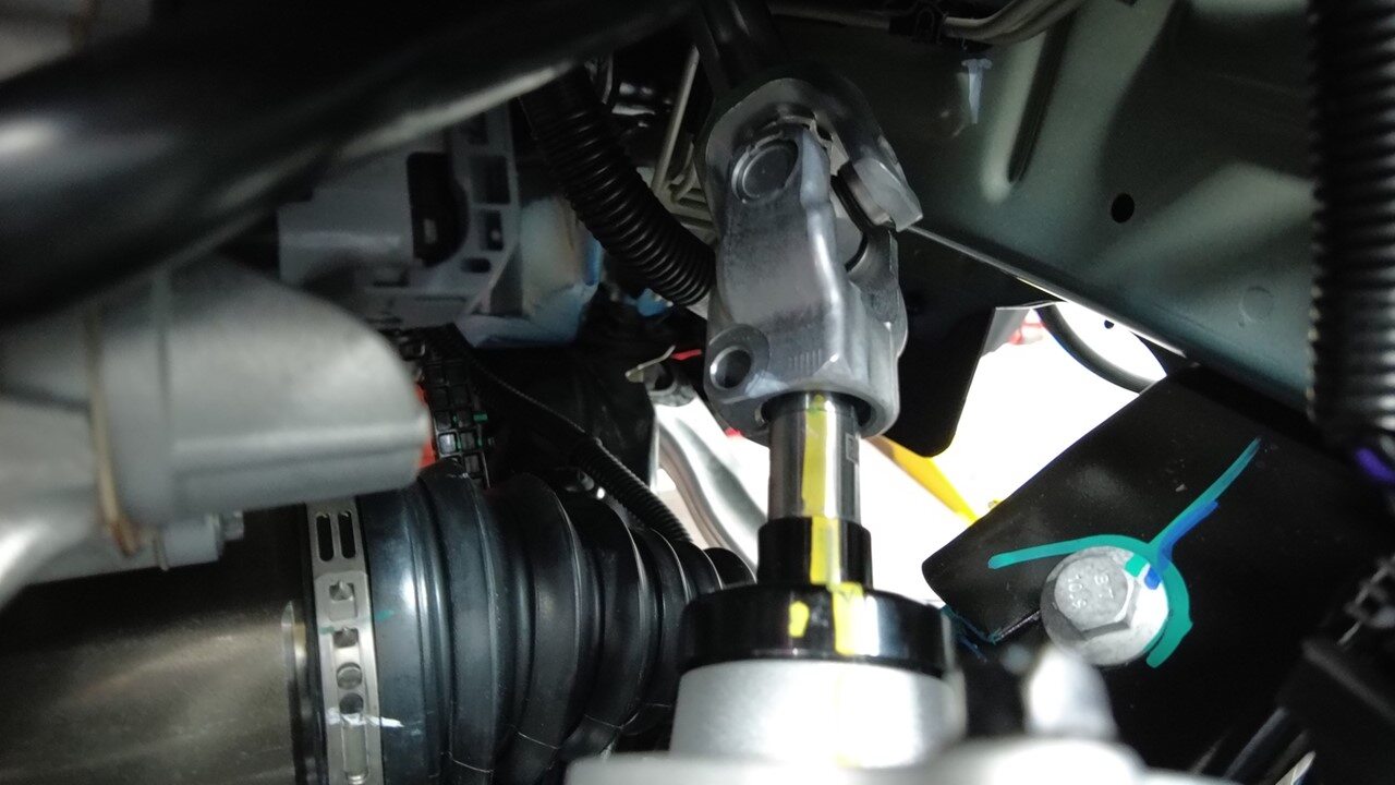 向下滑动中间轴总成,将其安装到转向机总成上。
