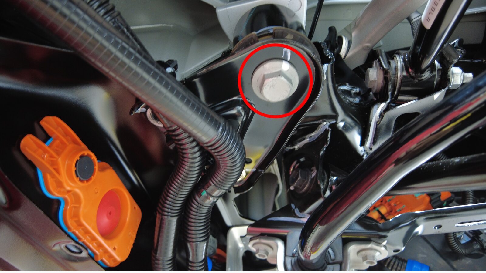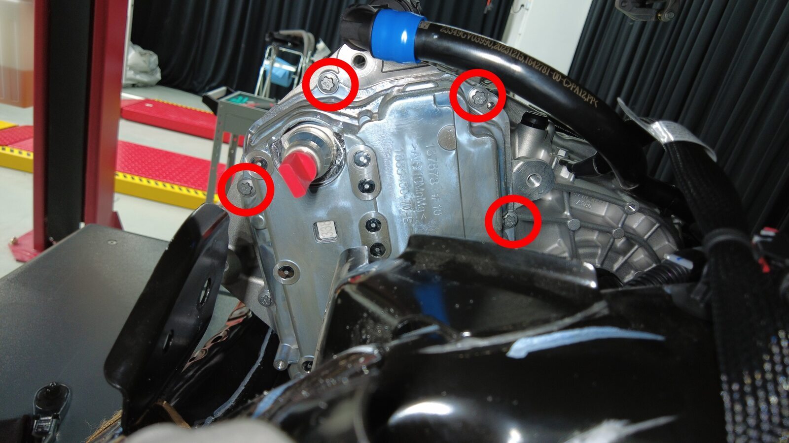 安装用于固定后驱动电机变流器和电机三相电缆的螺栓。