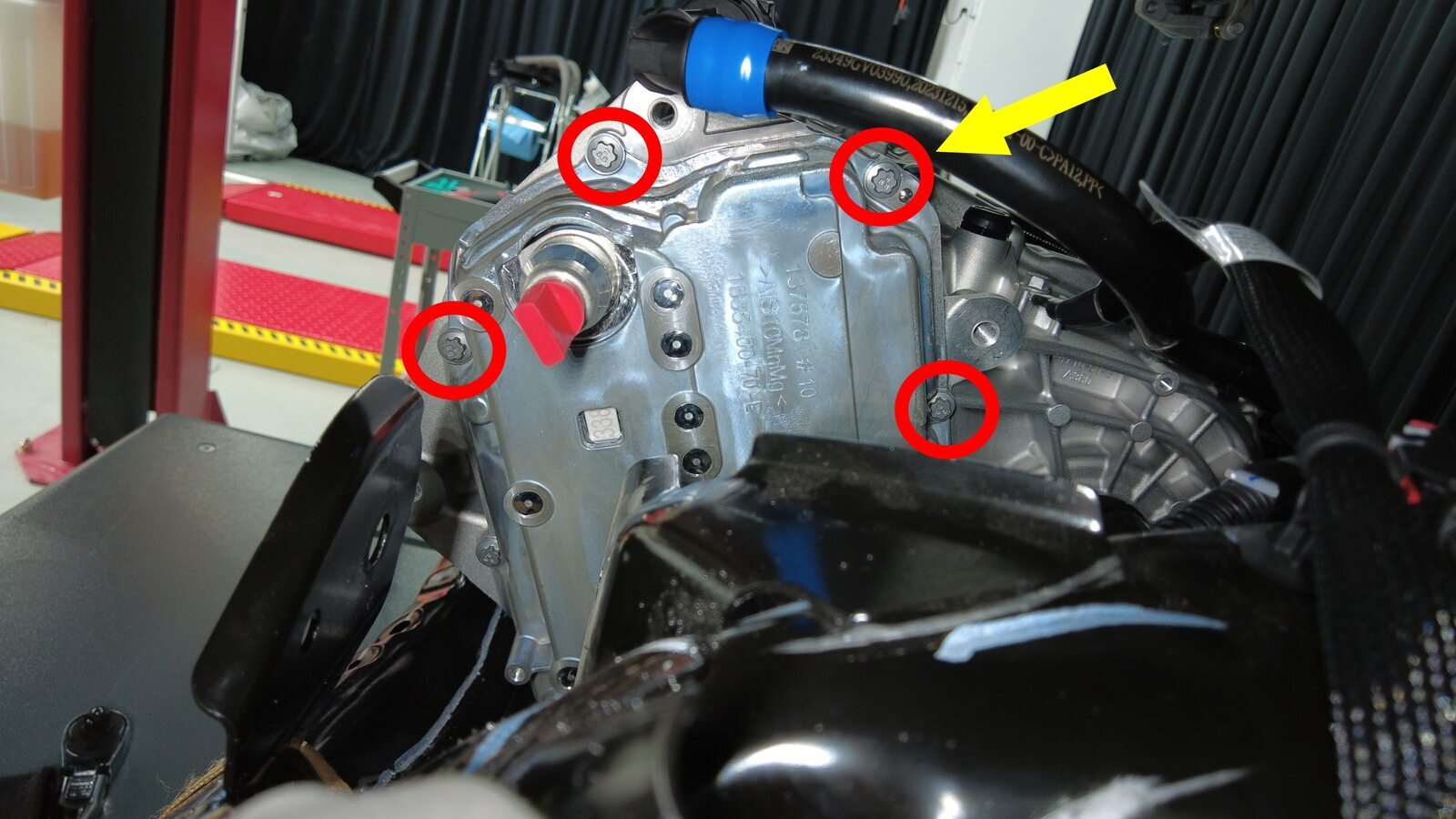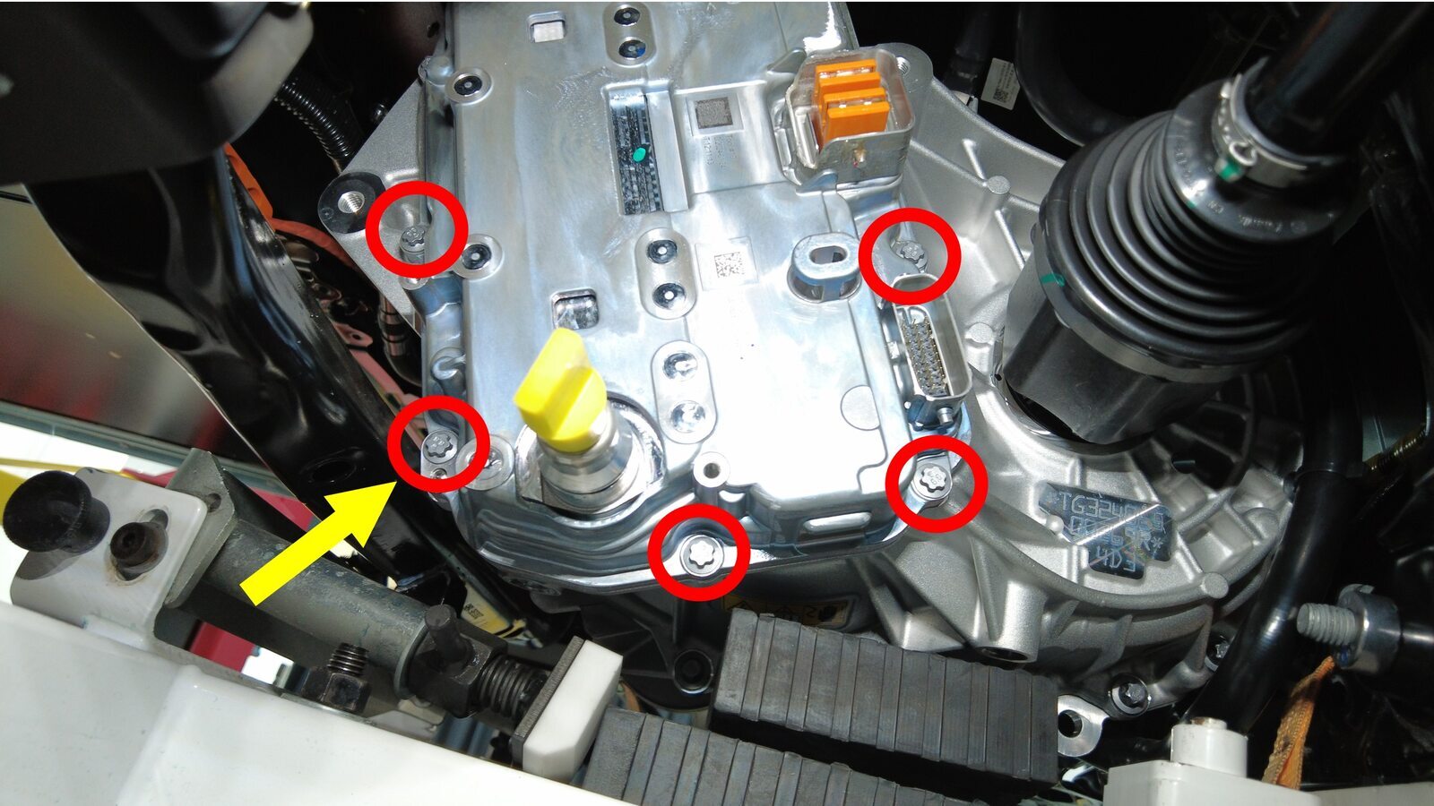 拆下将后驱动电机变流器固定到变速箱总成的螺栓。