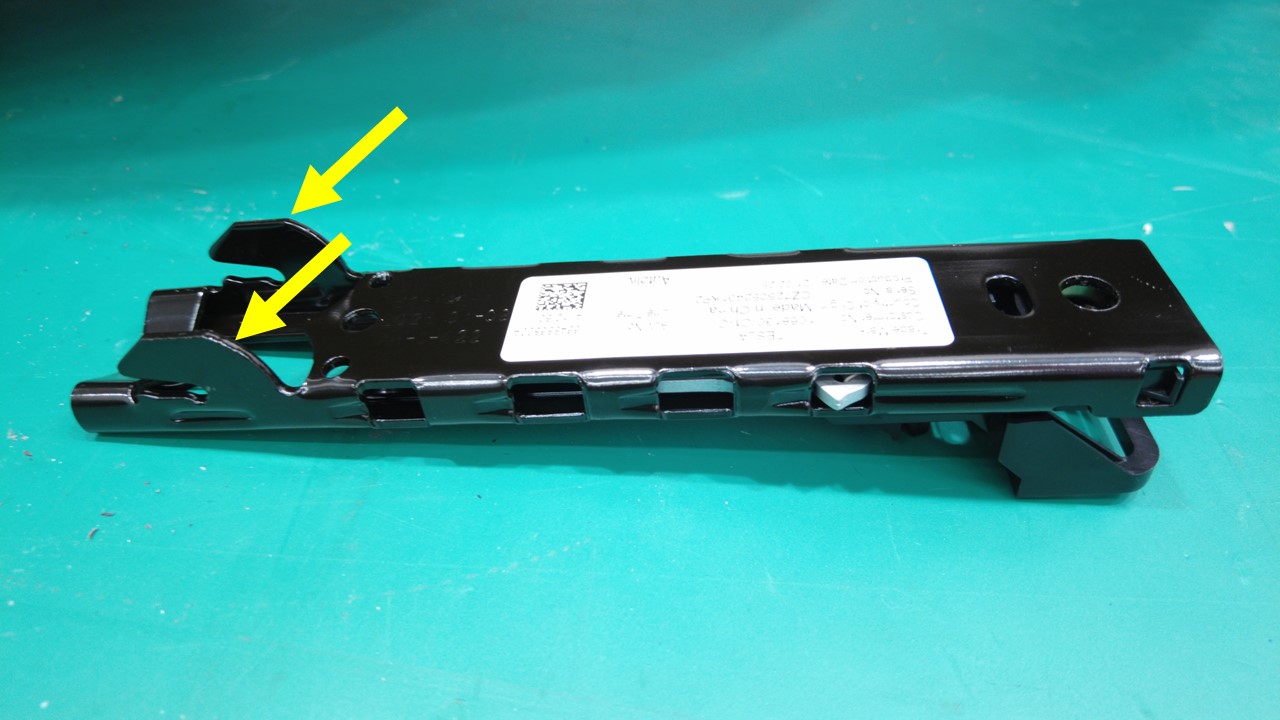 松开将左侧高度调节器固定到车身的锁片(2 个),然后将高度调节器从车辆上拆下。