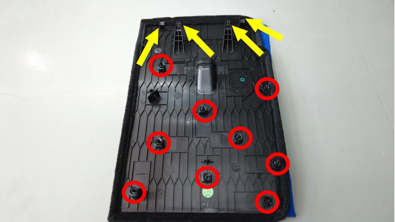 拆下将右侧座椅靠背总成固定到车身的卡子(9 个)和挂钩(4 个)。