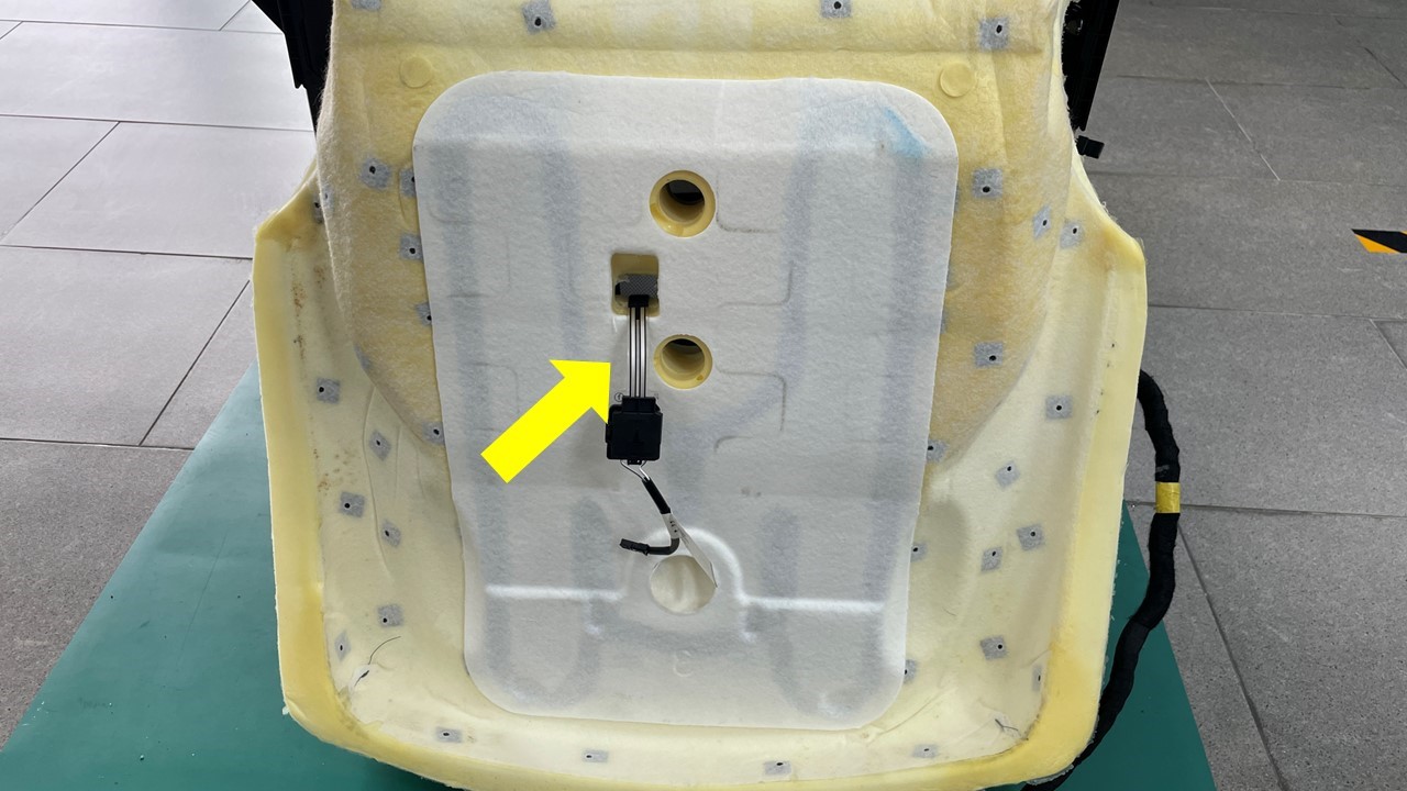 揭下新的占用传感器上的胶膜,将传感器连接器穿过新的座垫泡沫,然后将传感器粘贴到泡沫上。