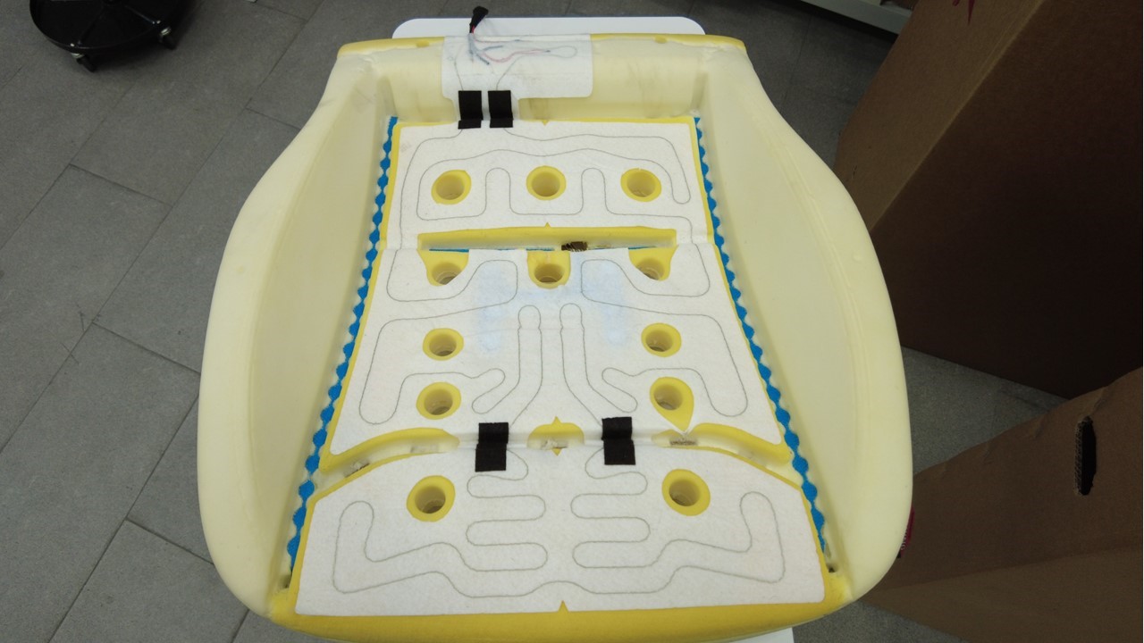 揭下新座垫加热垫背面的双面胶胶衬,然后将加热垫粘贴到座垫泡沫上。