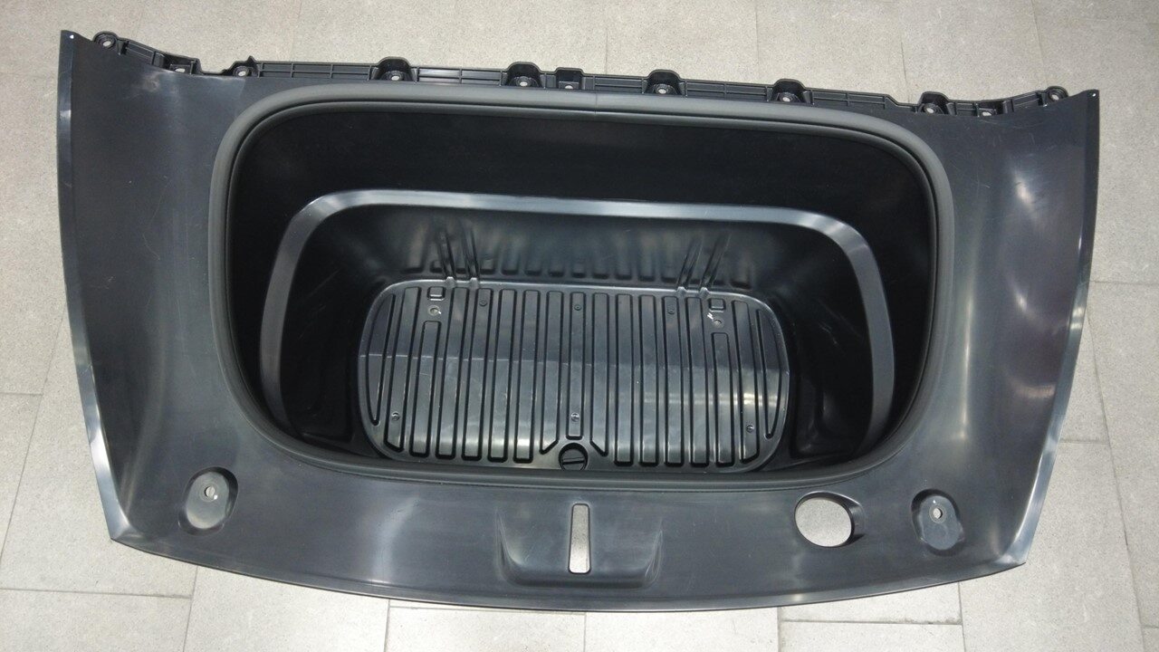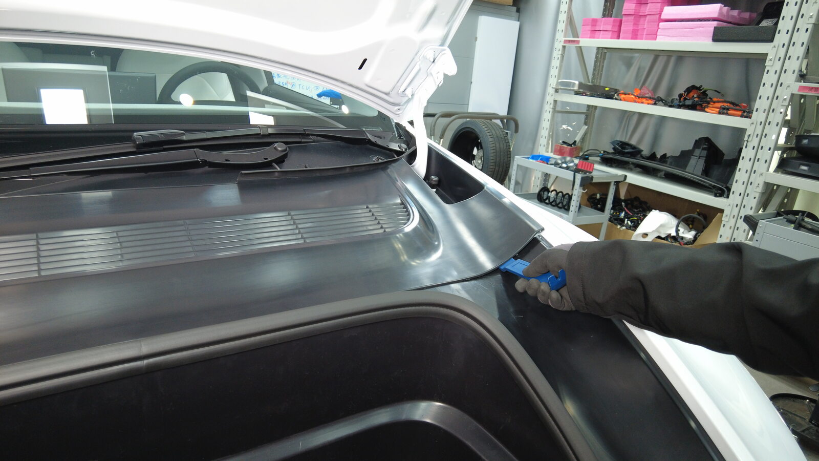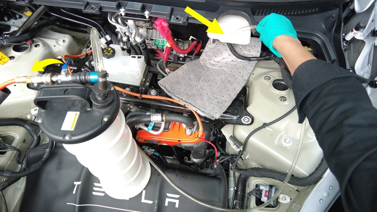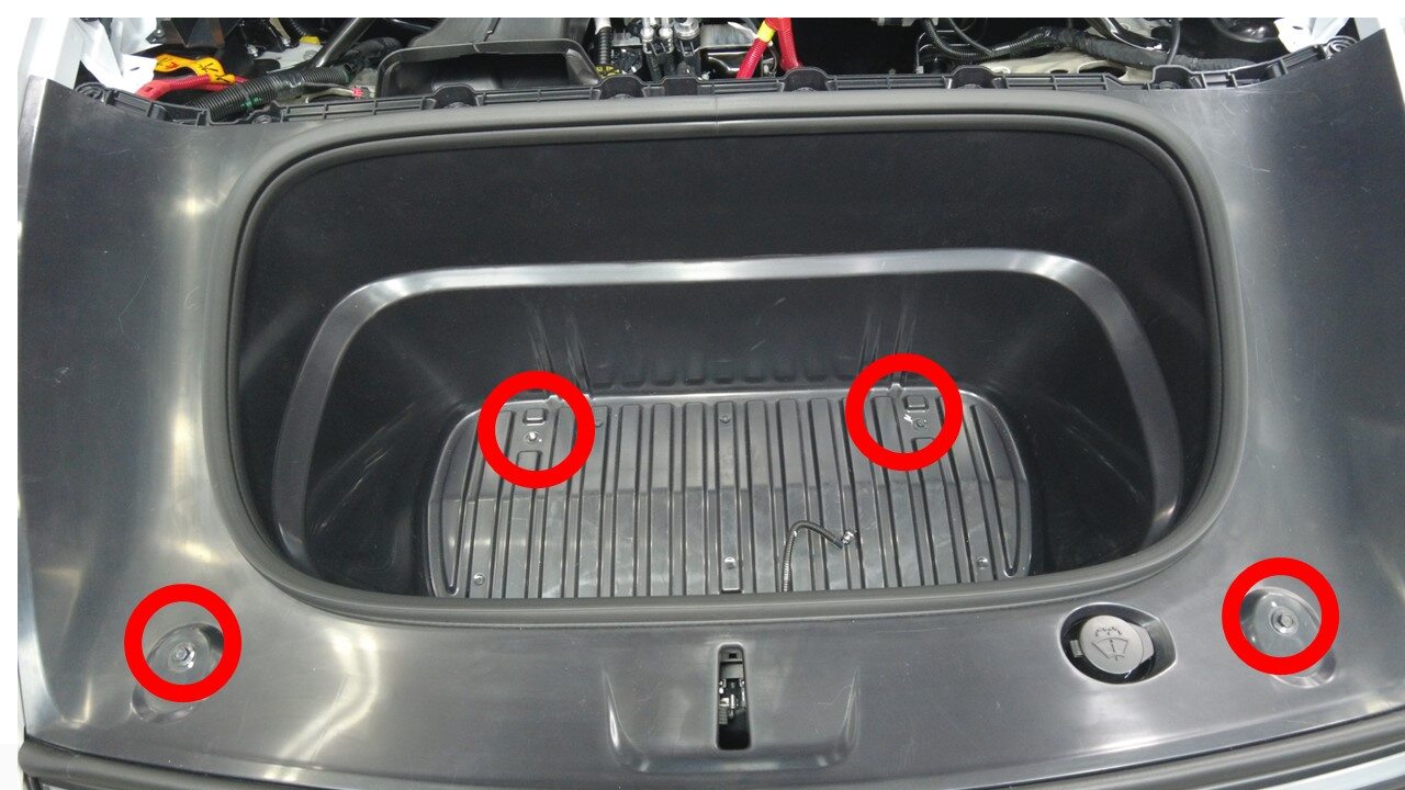 注2x bolts, 10mm, 10 Nm, Pivot rear edge up past brake reservoir then lift up to clear frunk assembly