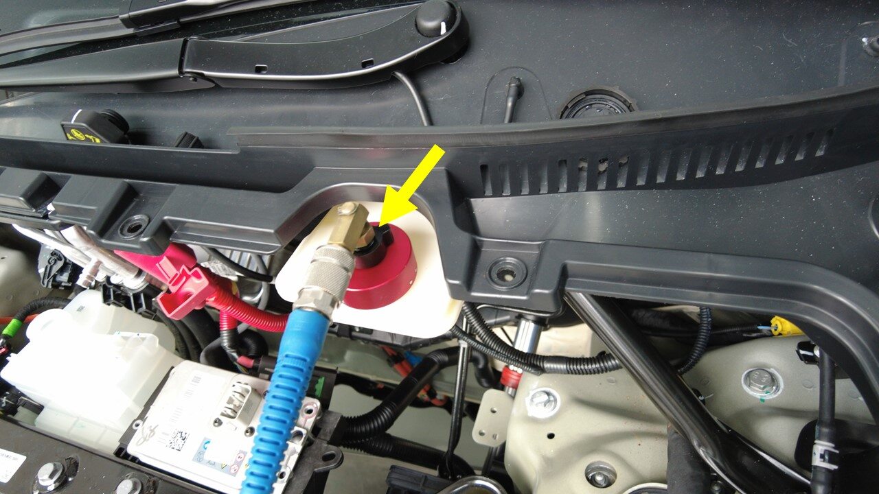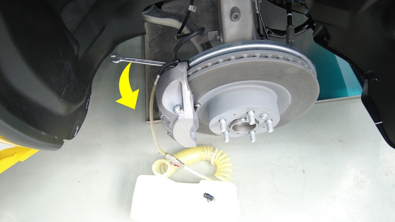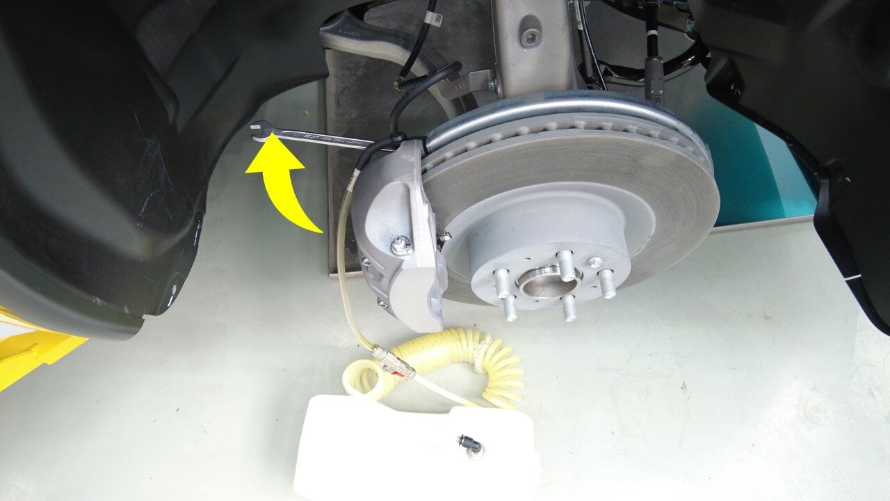 When the routine finishes, torque the LH front caliper bleed valve, and then remove fluid catcher.