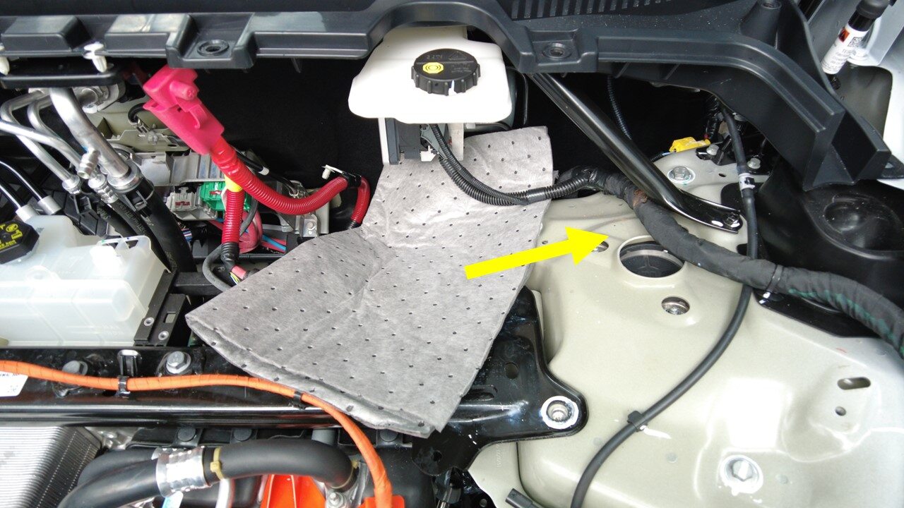 Remove absorbent material from underneath brake booster assembly and reservoir area