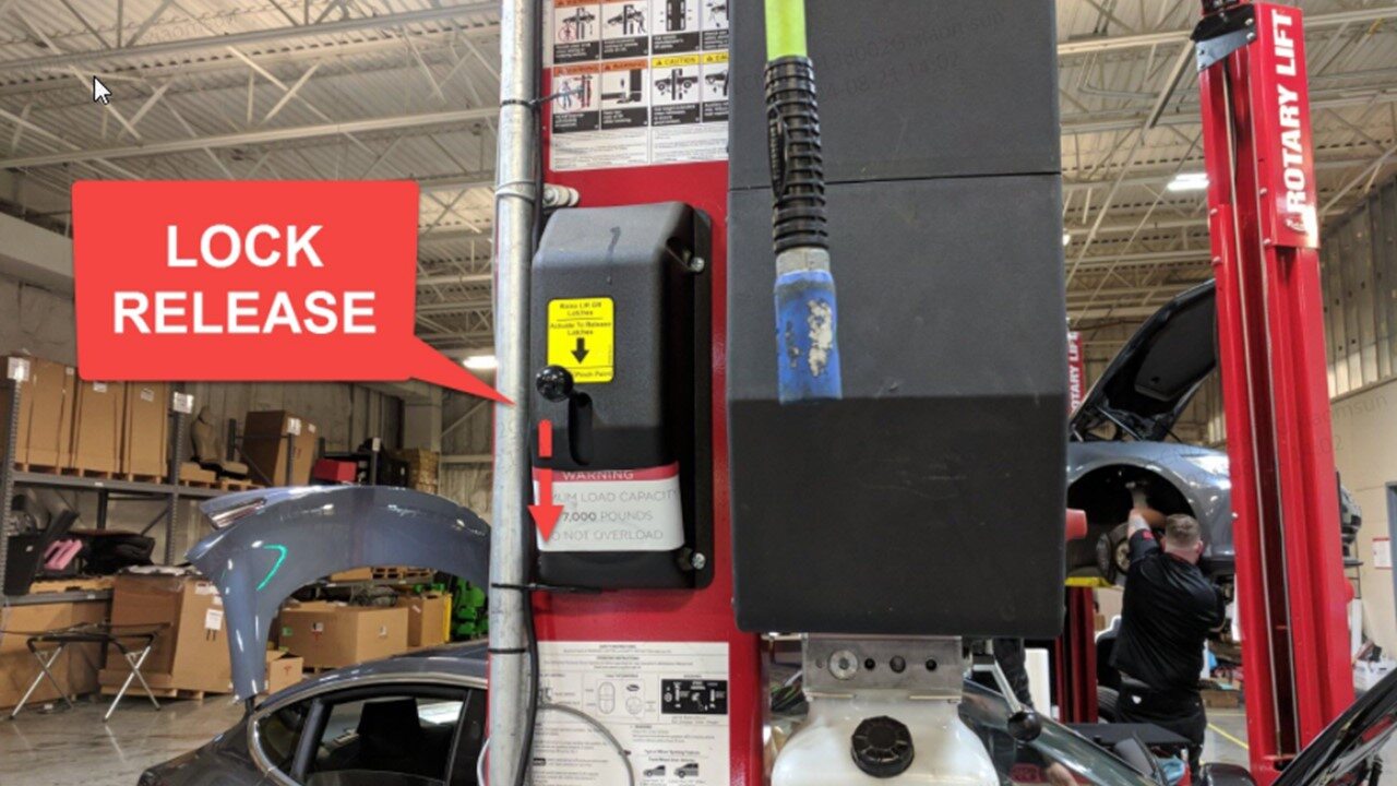 注Raise lift off locks, Then hold lock release lever to keep locks free while vehicle is lowered