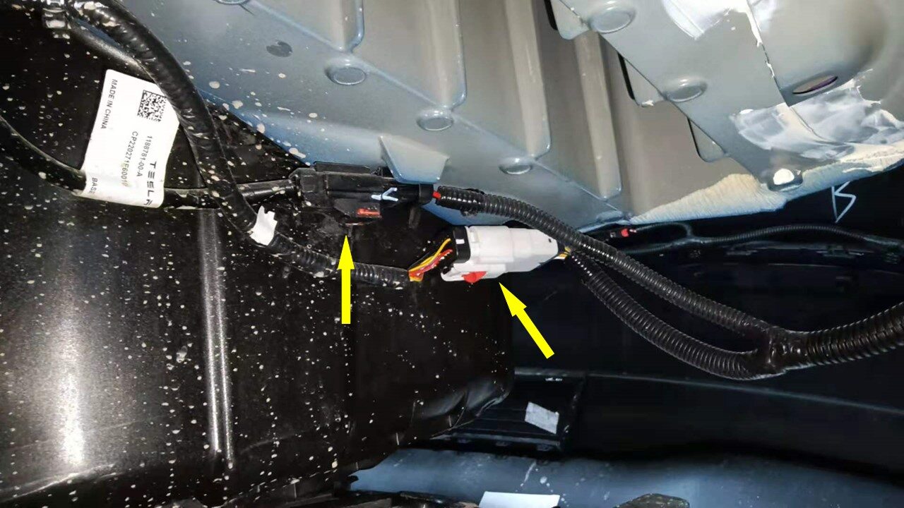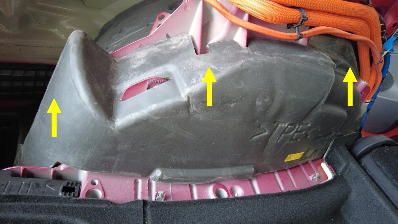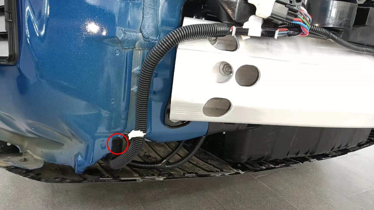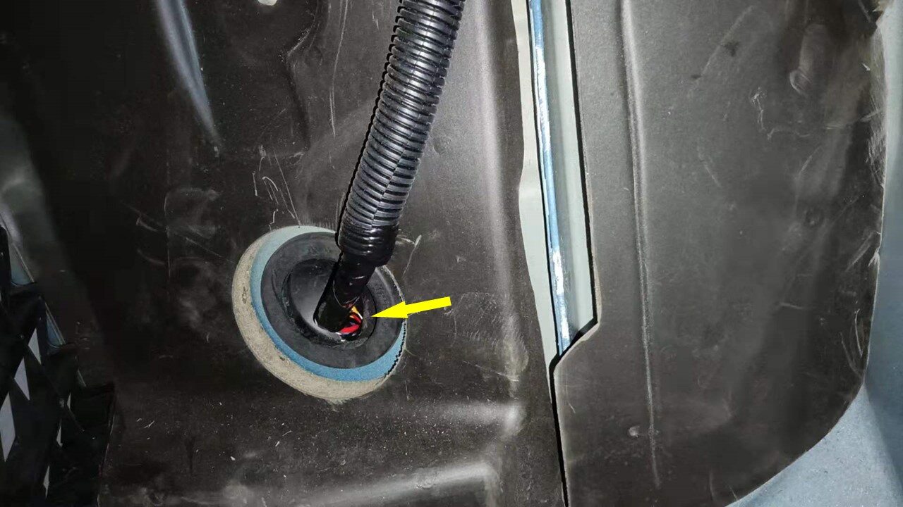 注线束应该穿过左后轮毂内衬区域后部附近的后备箱内。