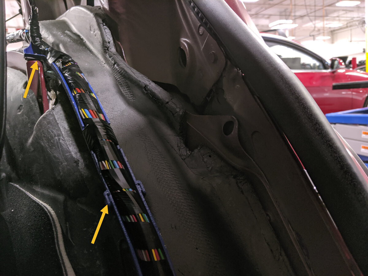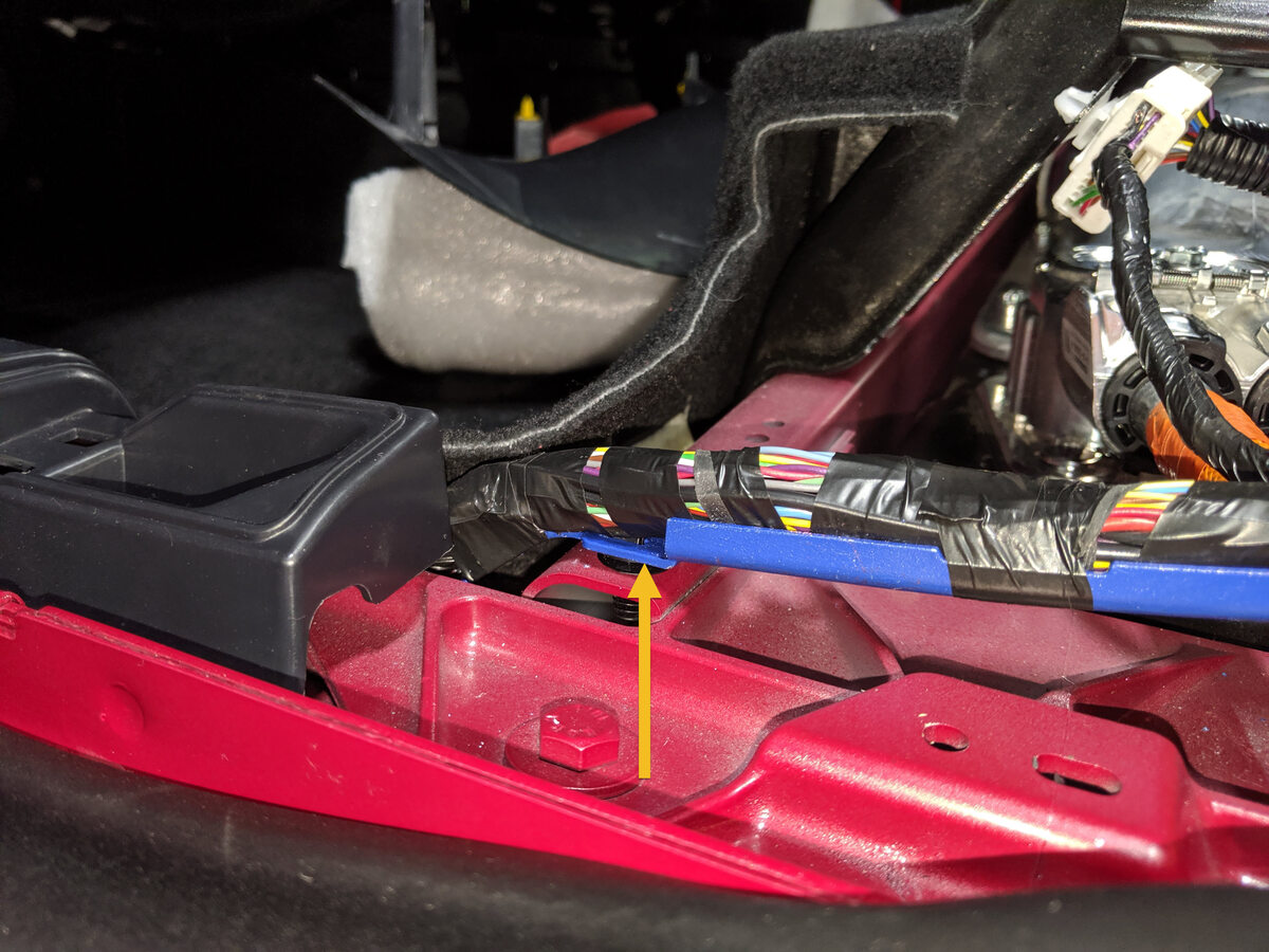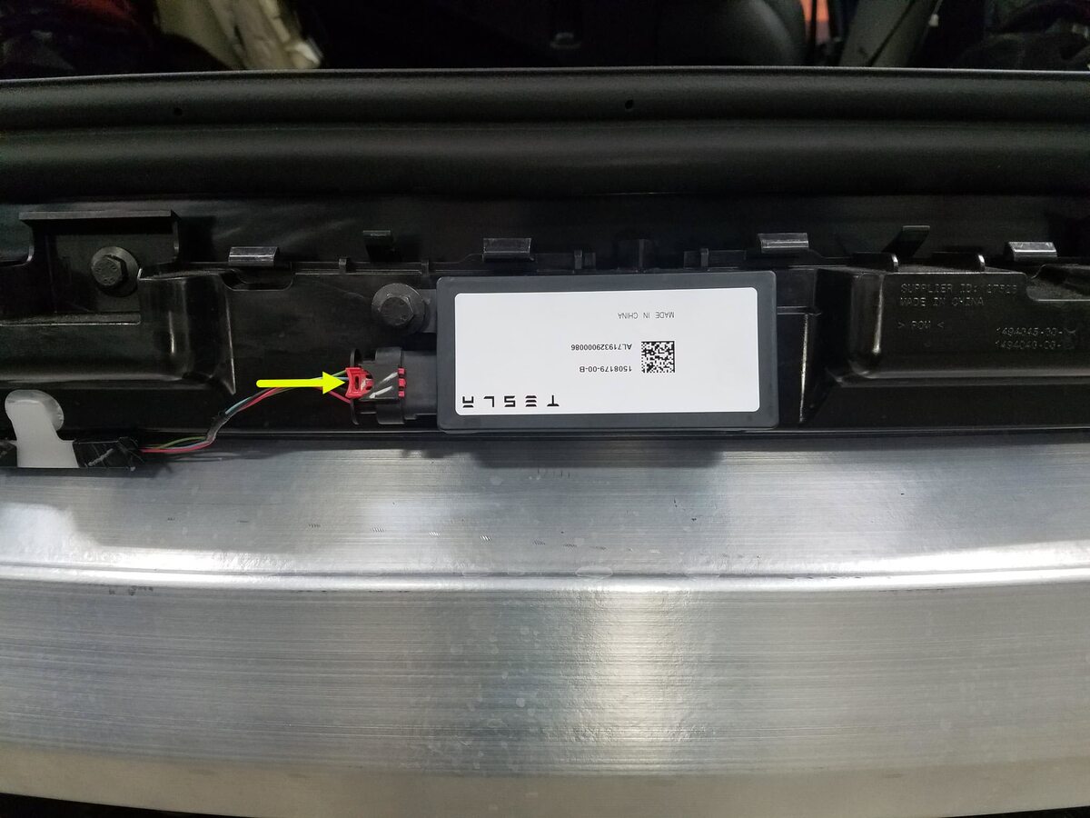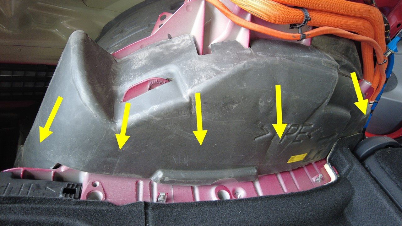 注线束应该穿过左后轮毂内衬区域后部附近的后备箱内。