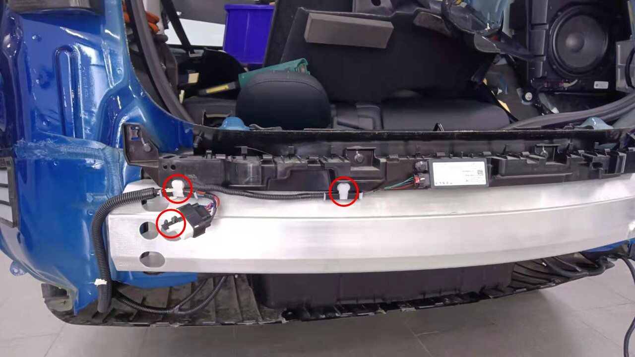 将后部车身线束安装到后饰板中间支架上(4 个卡子)。