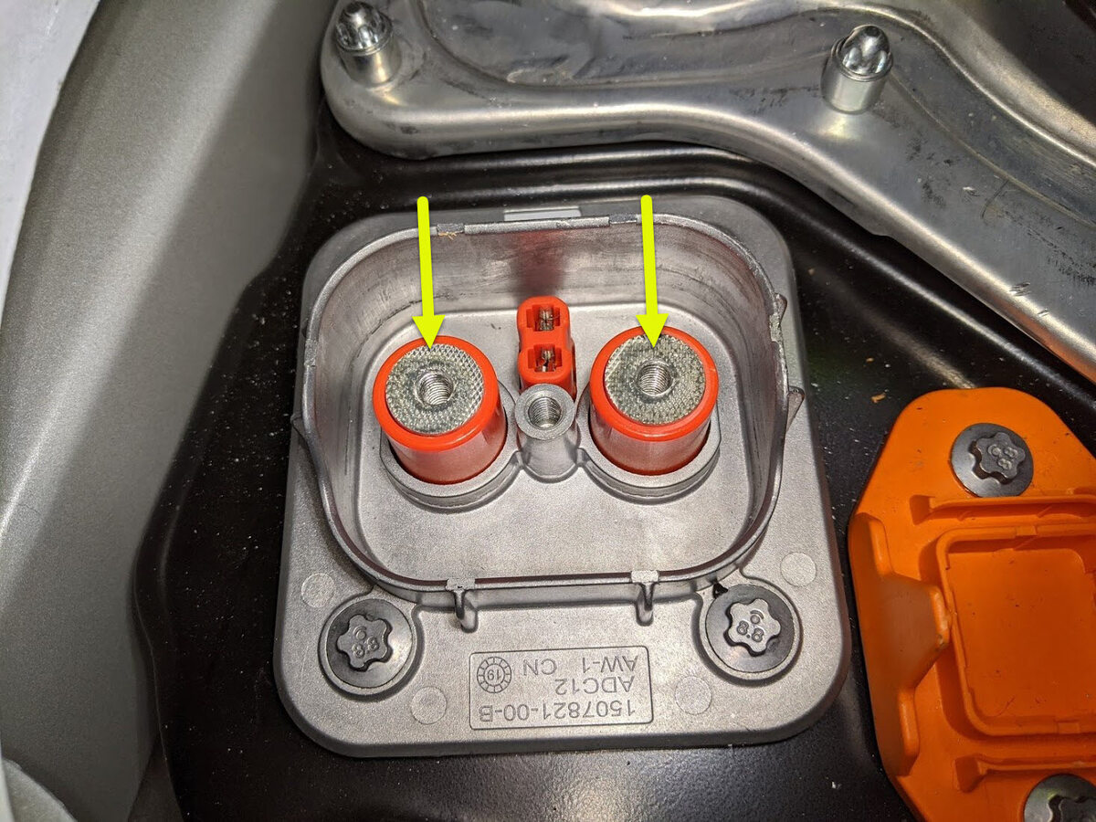 安装将充电接口母排套件固定到高压接头的螺栓(2 个)。