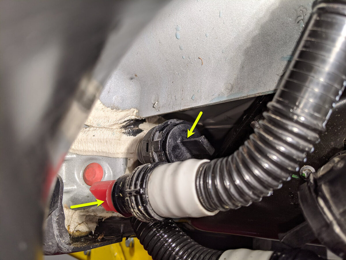 注等待冷却液泵停止运行(可以听到清晰的杂音)。屏幕上会立即显示 "Success",但是冷却液泵将运行 10 分钟。注如果这一时间段内启用了下一程序,本例行程序将失败。确保车辆未处于“前进”挡。尽管出现停止消息,但计划仍在运行。注可以在动力总成温度系统选项卡下的 “garage” 条目下监测冷却液泵速度(怠速 = 约 1500 RPM)。测试速度将在 3500RPM 至 6500 RPM 之间变化,启动的阀门将在串联和并联之间切换。将车辆挂入“前进”挡将停止此例行程序。如果冷却液速度徘徊在 7000 RPM 左右,则说明冷却液泵存在气锁状况。请重新执行真空加注。注继续添加冷却液并排空空气,直至冷却液液位介于冷却液罐上的 NOM 线与 MAX 线之间。