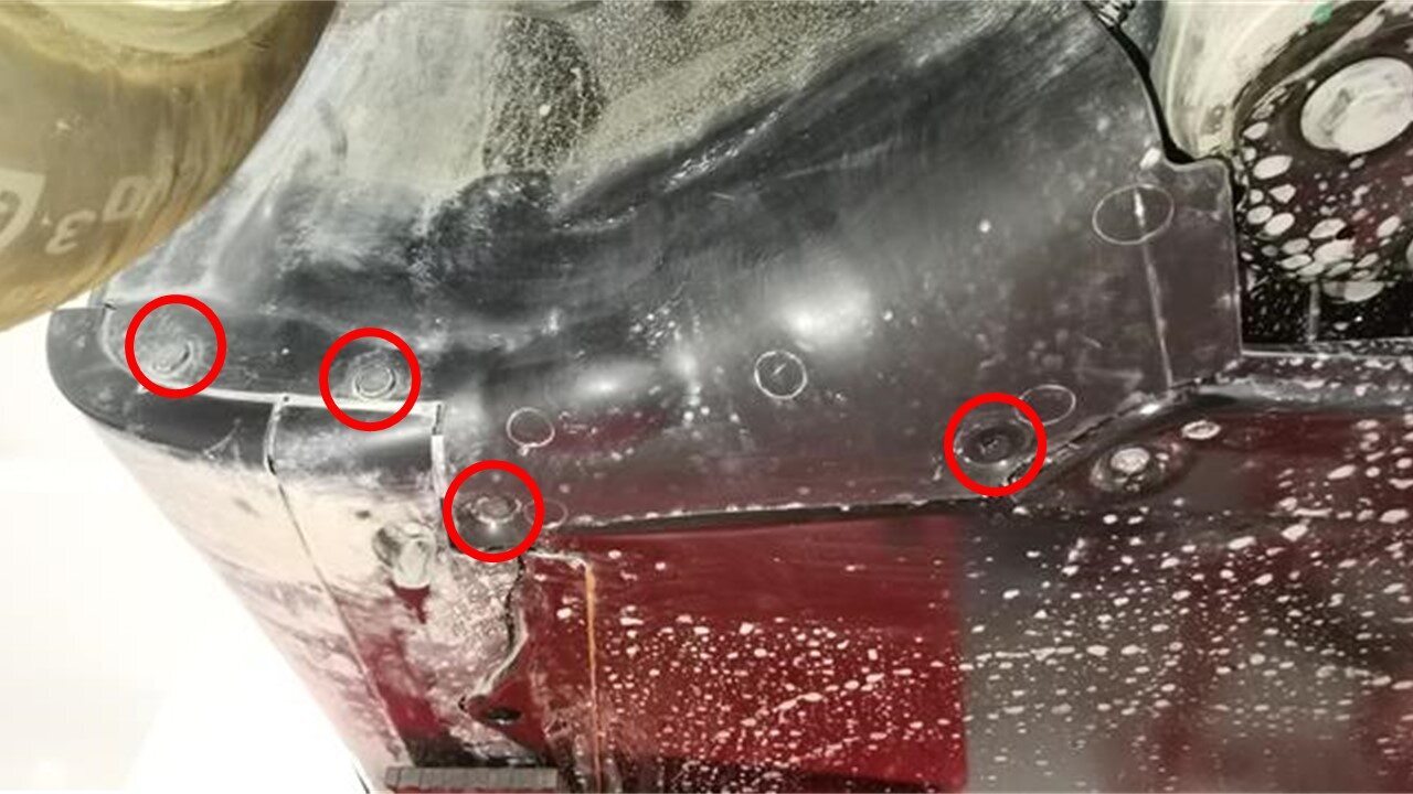 安装将右前轮毂内衬固定到高压电池的螺栓并紧固推拉式卡子(3 个),然后降下轮罩区域。