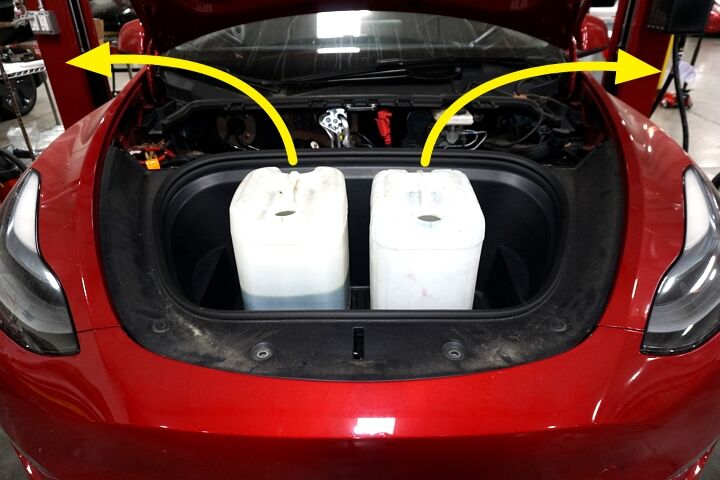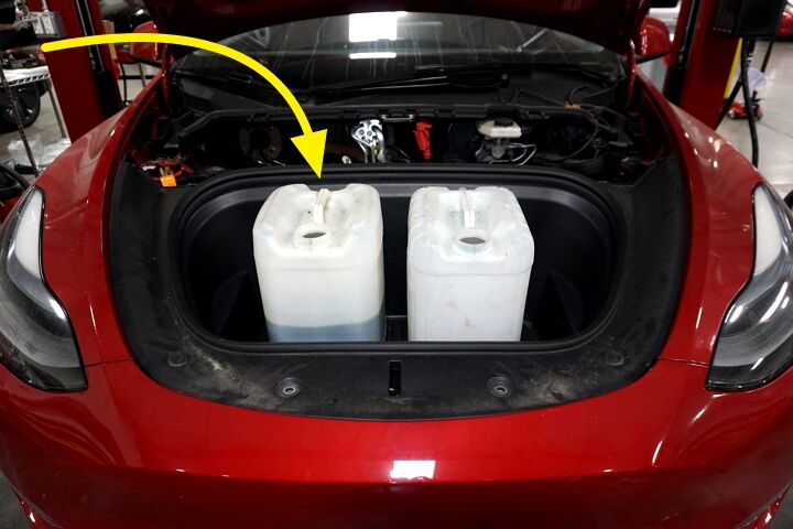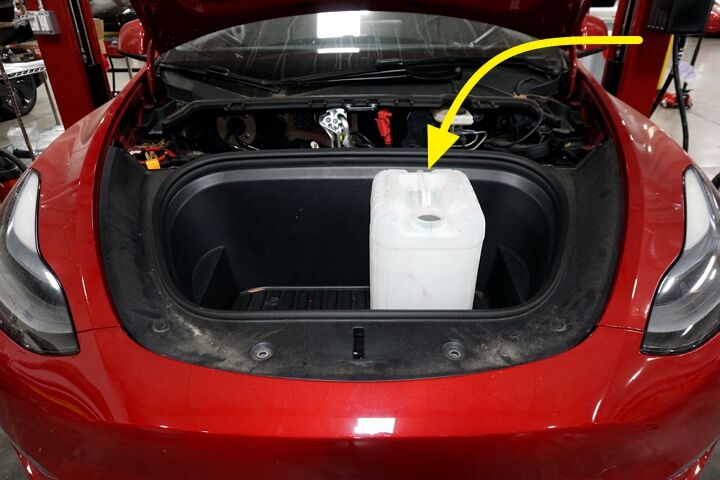 将加注好的冷却液容器放置在前备箱储物单元前部储物区域。