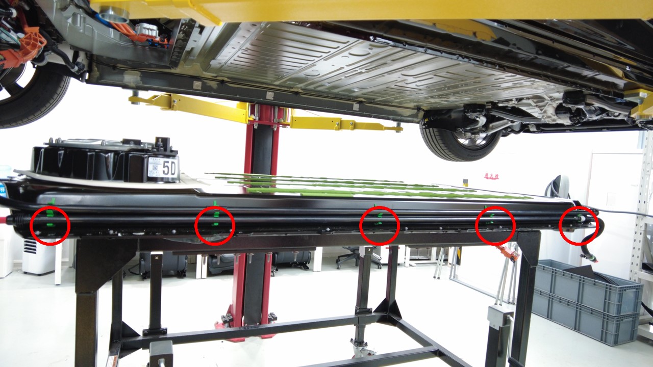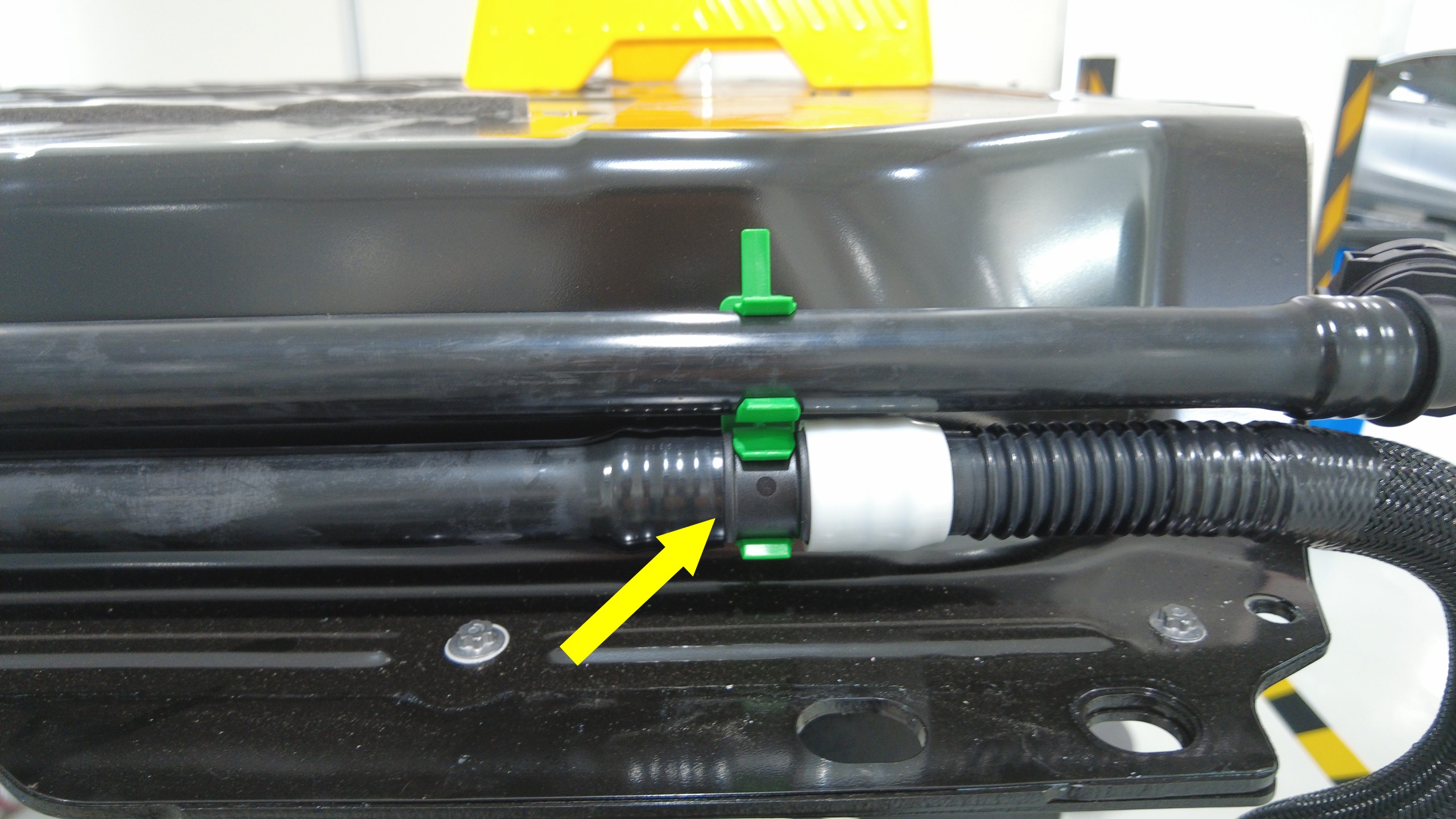 安装卡子(5 个),将动力总成回流管紧固到高压电池右侧。