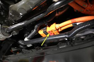 - 将连接器与前驱动单元对齐,然后在完全锁紧连接器之前拆下高压连接器杆锁。