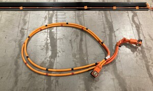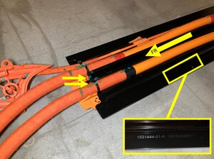 将前驱动单元高压线束放置在高压电池中间滑板上。