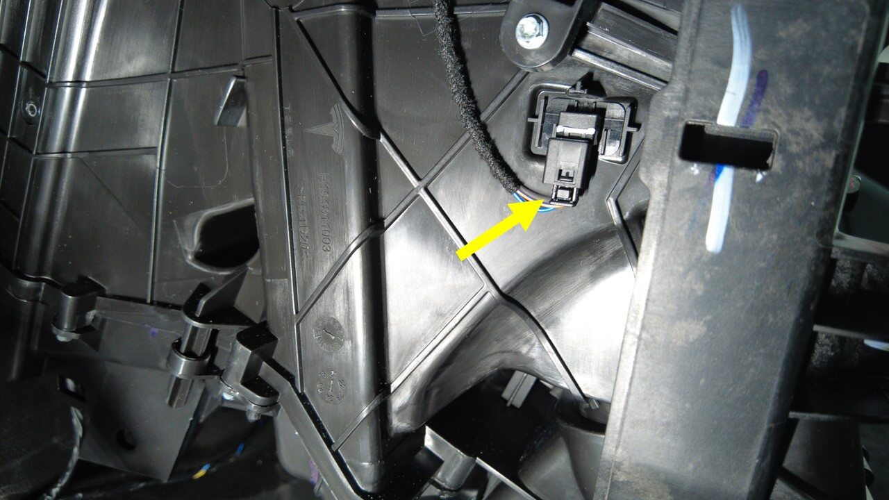 挤压两侧锁片(2 个),然后将蒸发器热敏电阻从 HVAC 总成上拉出。
