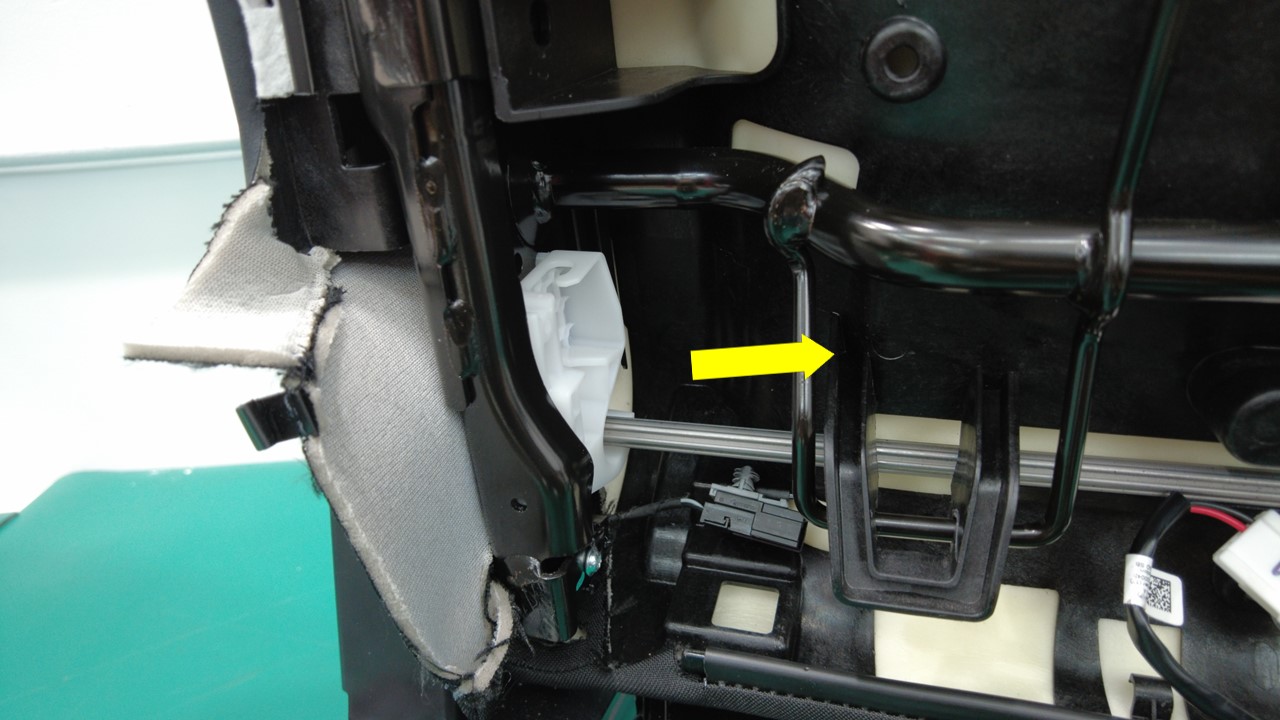 将第三排左侧座椅头枕线缆与凹槽对齐,使用加长尖嘴钳将线缆插入,然后顺时针转动线缆,将其安装并紧固到外侧靠背倾角调节止动块上。