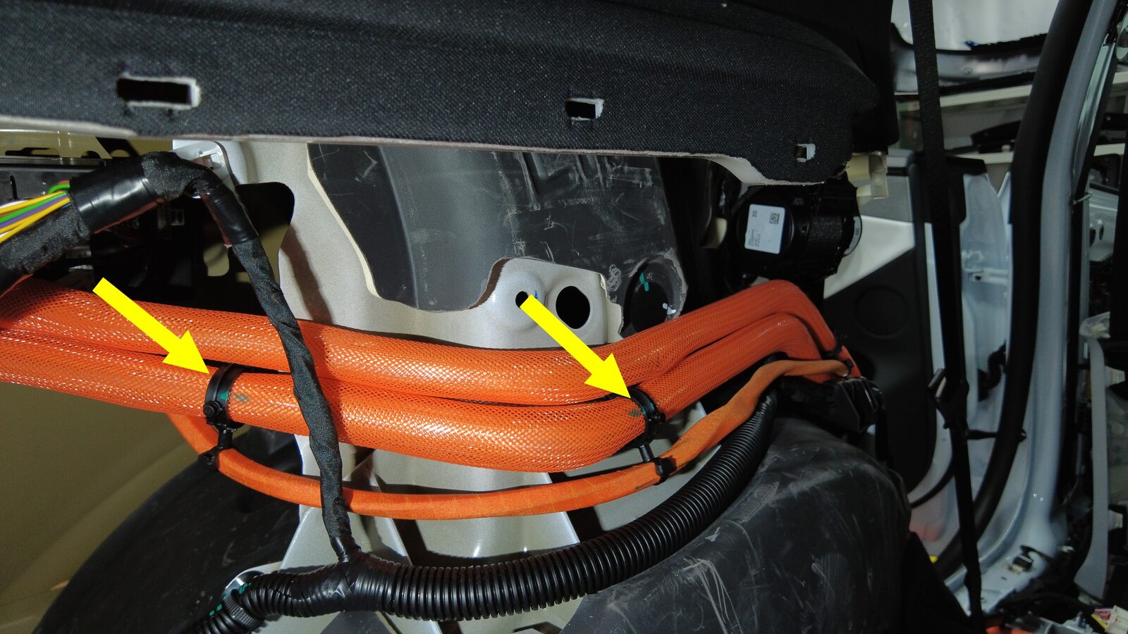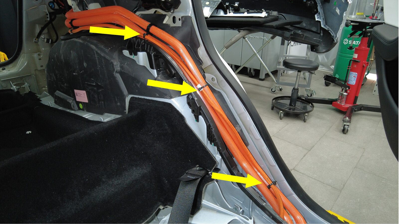 在协助下,将充电接口母排穿过后备箱放置入位,以备安装。