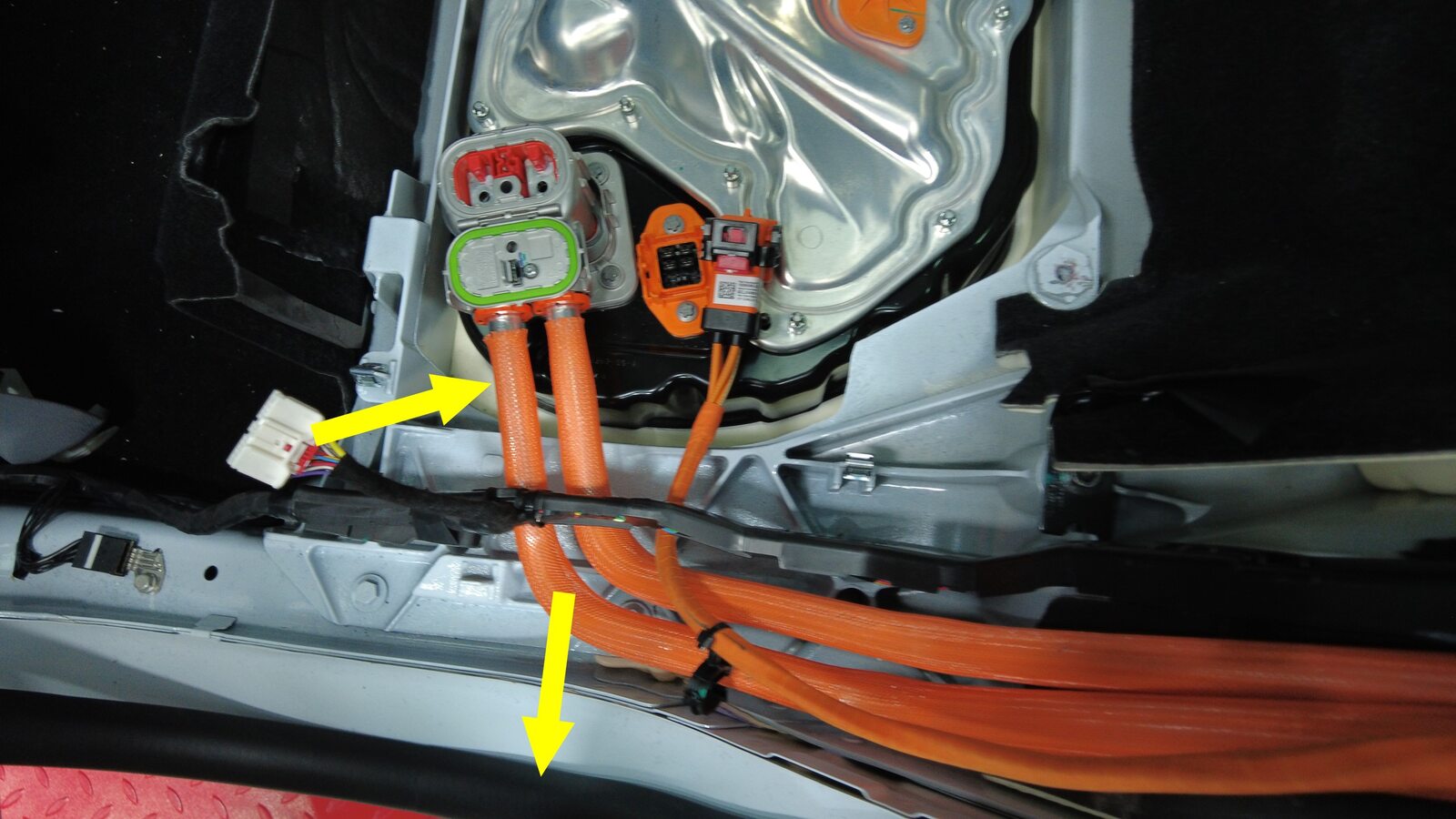 在高压电池仓处,使用 Hioki 电阻计测量充电接口母排引线与高压电池仓高压接头螺栓头之间的电阻。另请对其他引线和螺栓头执行该测试。