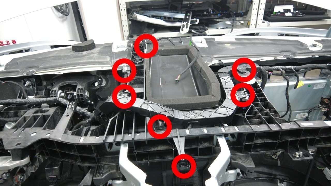 将仪表板线束夹(4 个)和线束底座(4 个)安装到横梁上部。