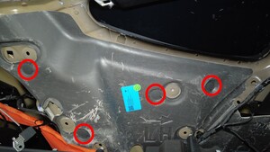 松开将左后围板绝缘体固定到车身的卡子(6 个),然后将绝缘体从车辆上拆下。