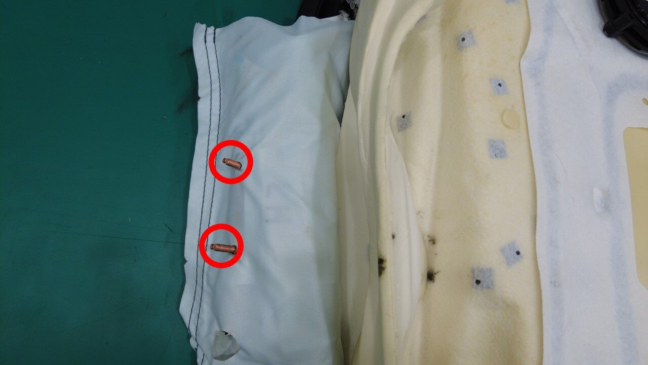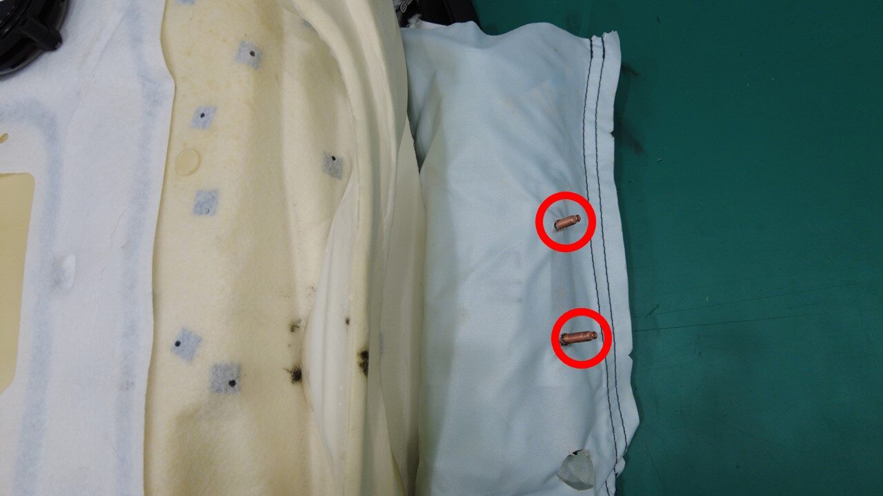 拆下并弃用将外侧气囊固定到座椅靠背框架的螺母(2 个),然后将气囊螺柱从座椅靠背框架中拉出。