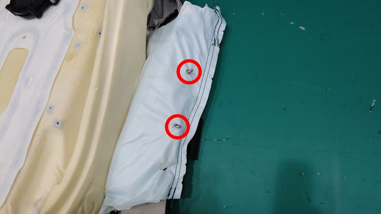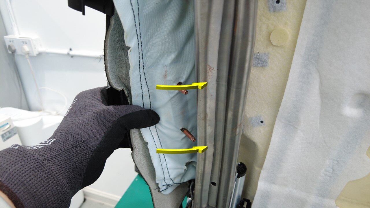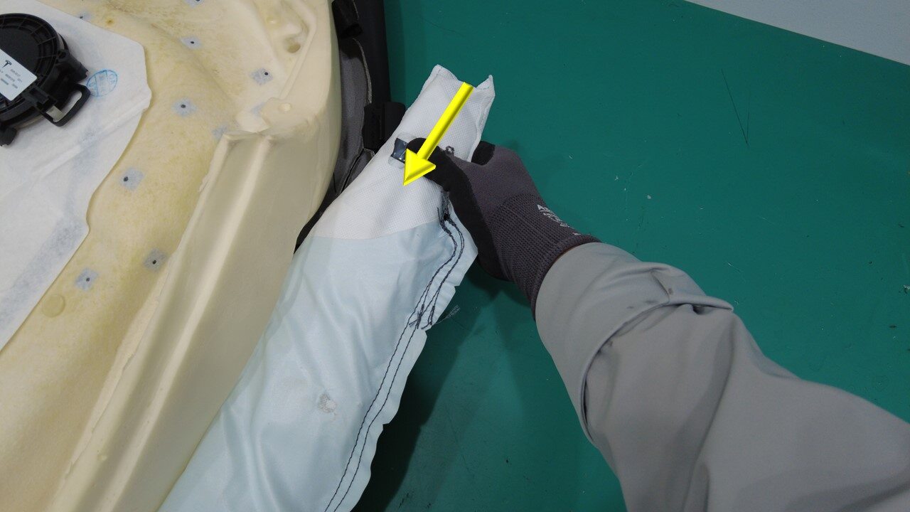 将外侧安全气囊滑槽连同其内部的气囊一起滑过座椅靠背泡沫,然后小心地将气囊从气囊滑槽上拆下。