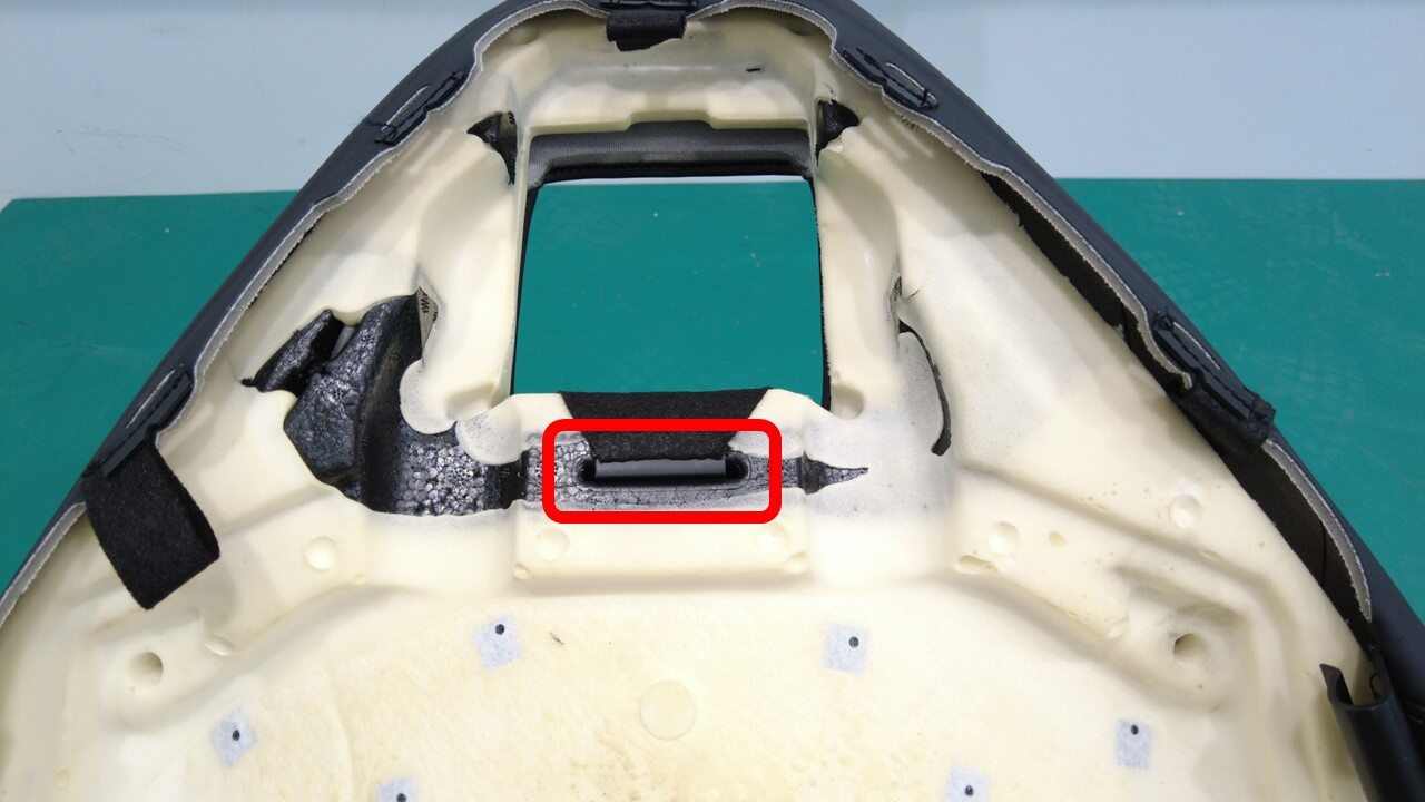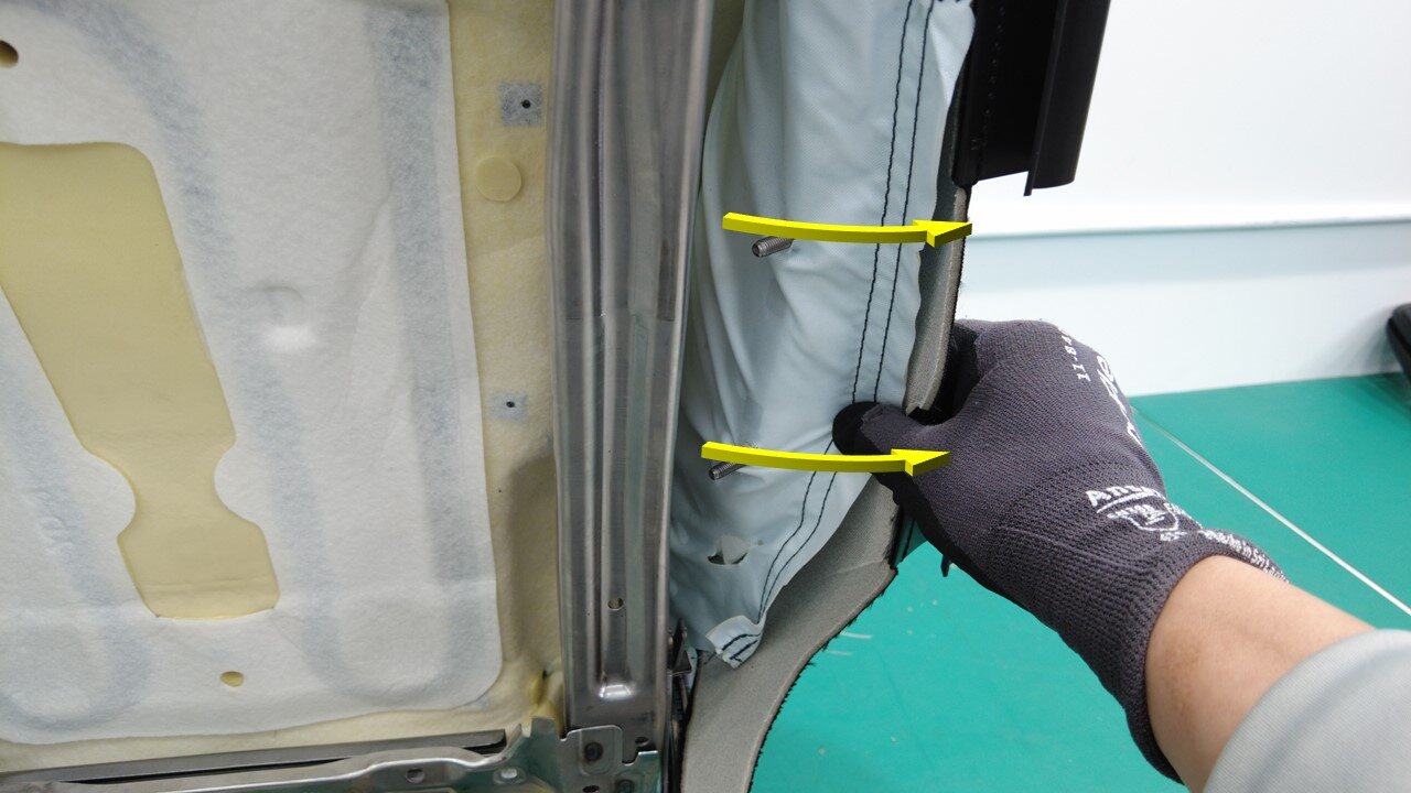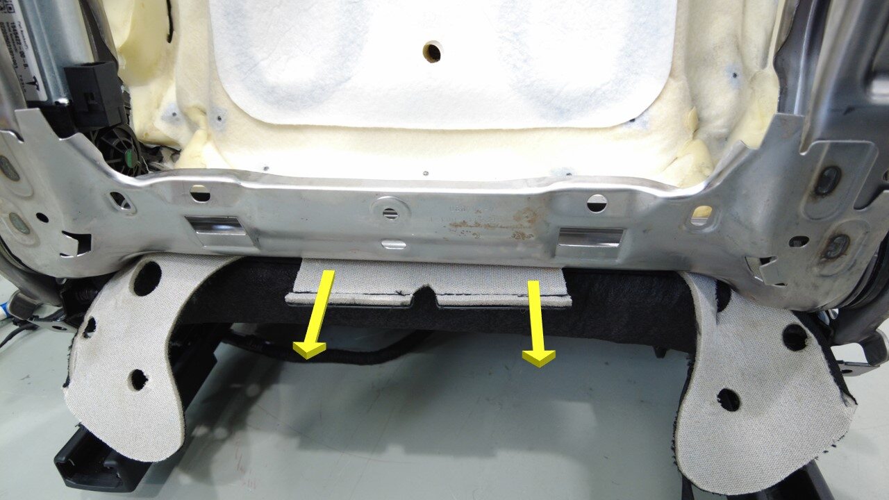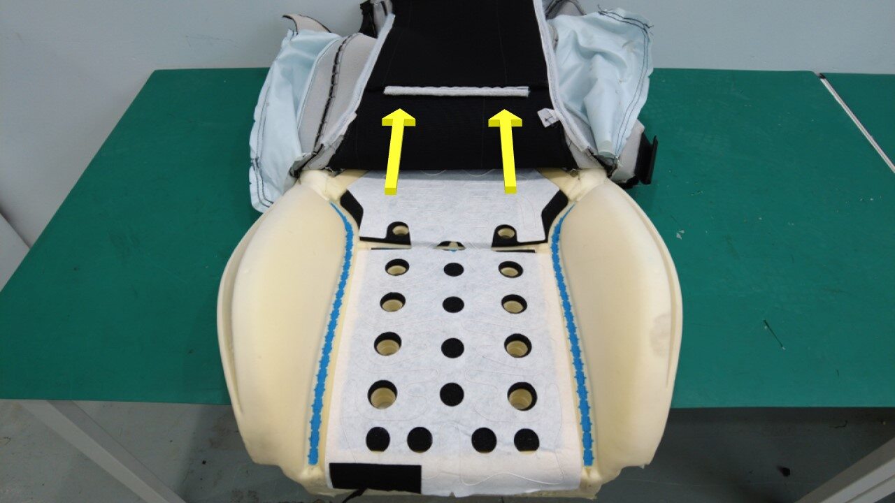 注首先,将泡沫饰板垂直滑入座椅靠背框架。务必将与框架接合的加热器线束及下饰板推入框架背面。