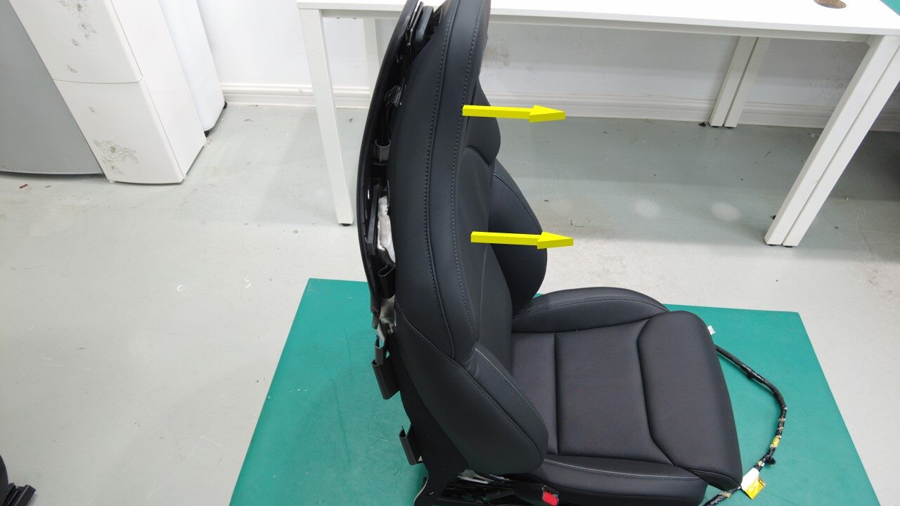 将驾驶位座椅外侧安全气囊安装到气囊滑槽中,然后将气囊滑槽连同其内部的气囊一起插入座椅靠背泡沫上的凹槽中。