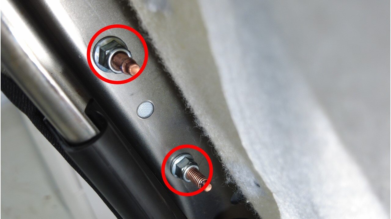 将驾驶位外侧安全气囊螺柱放置在座椅框架上,然后安装新的螺母(2 个),将驾驶位座椅安全气囊固定到座椅靠背框架。