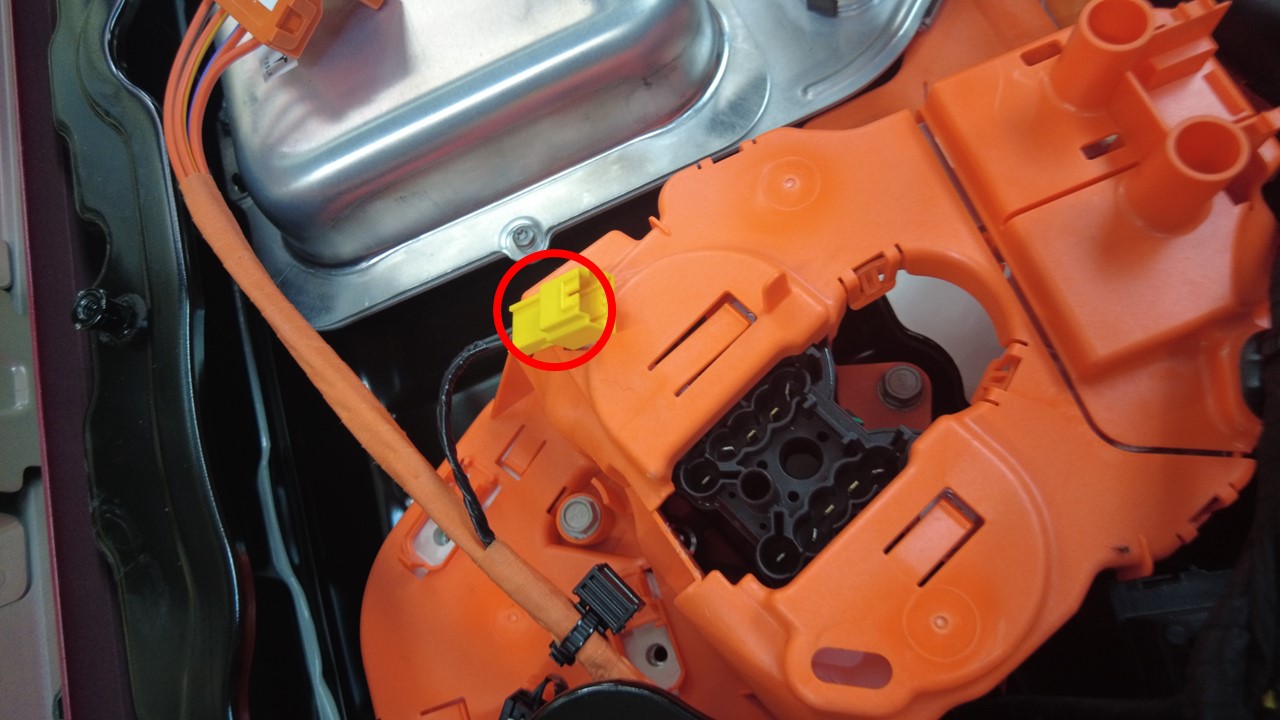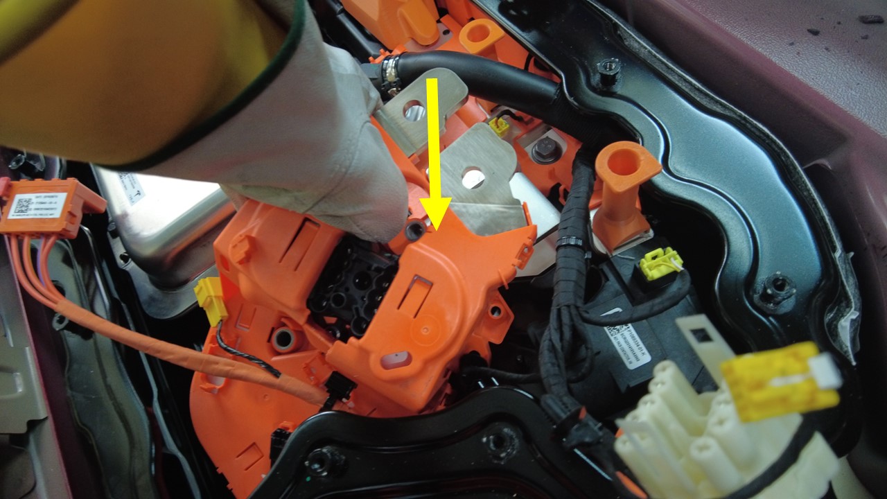 拆下将快充触点开关总成固定到高压电池仓的螺栓(2 个)。