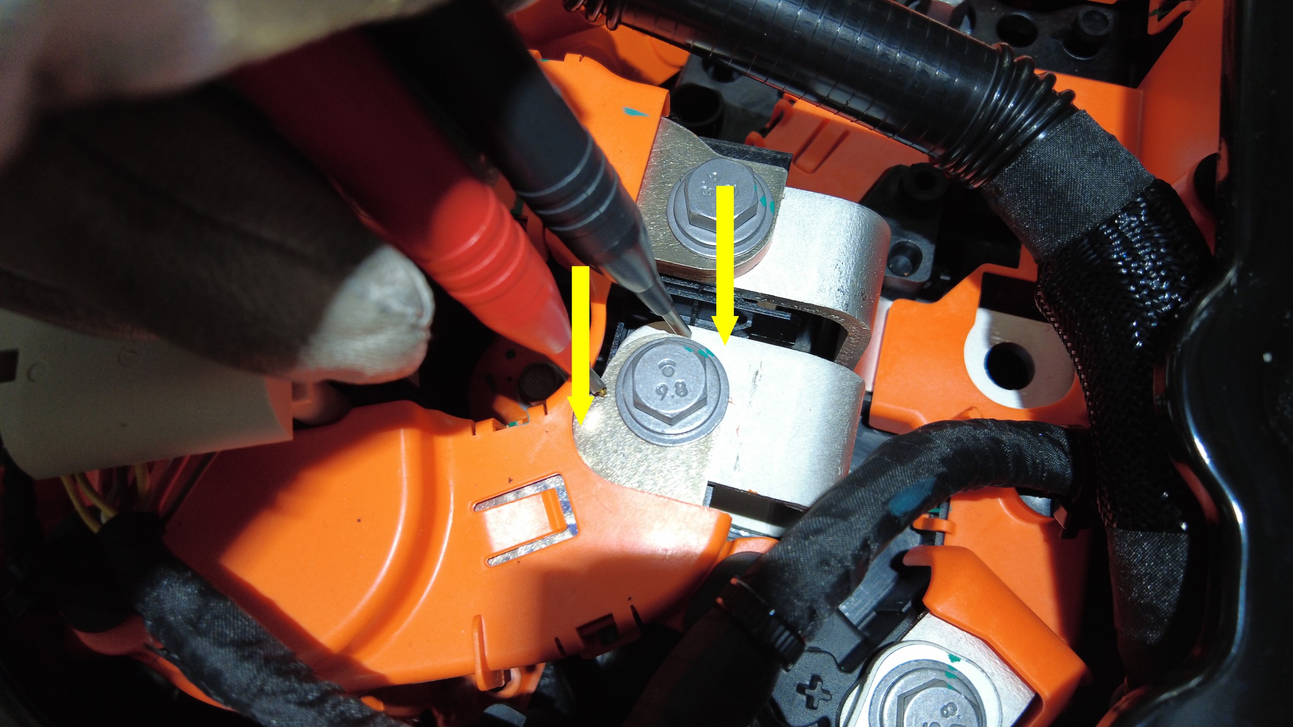 在负极高压接头处执行 Hioki 阻抗测试,确保电阻值为 40 微欧或更低。