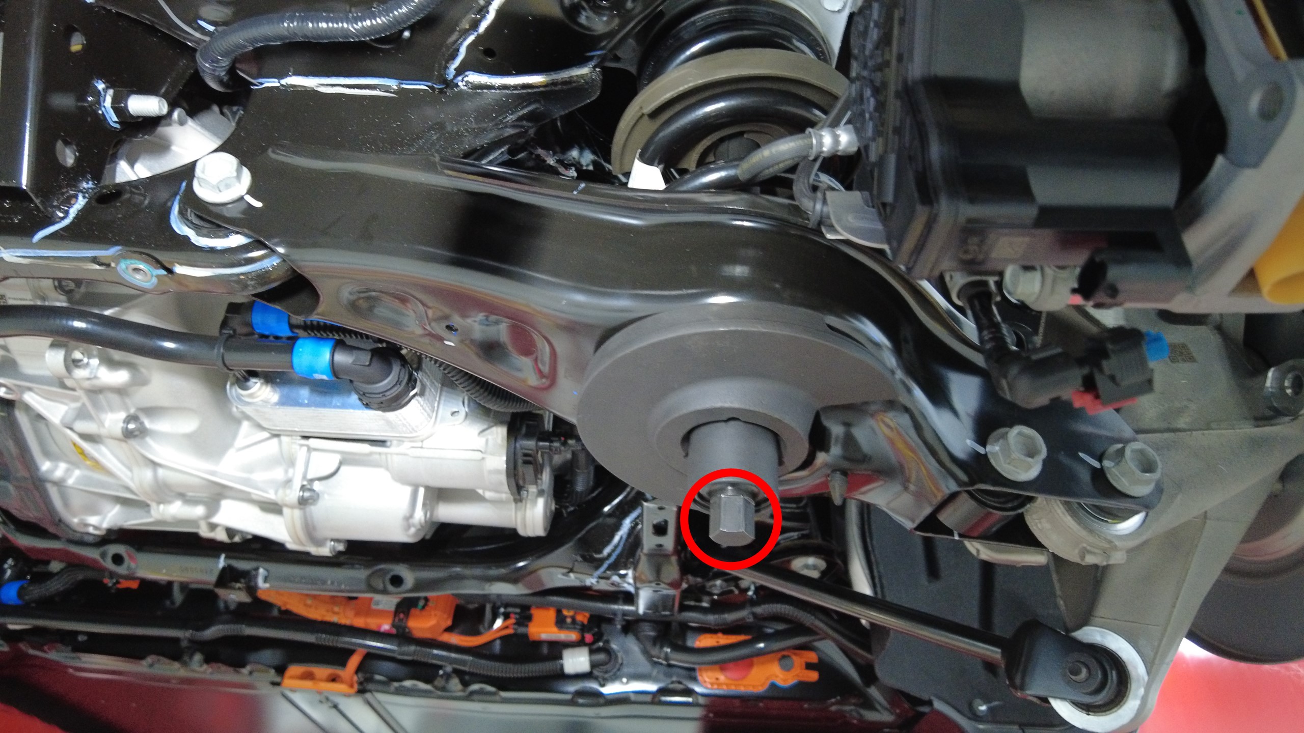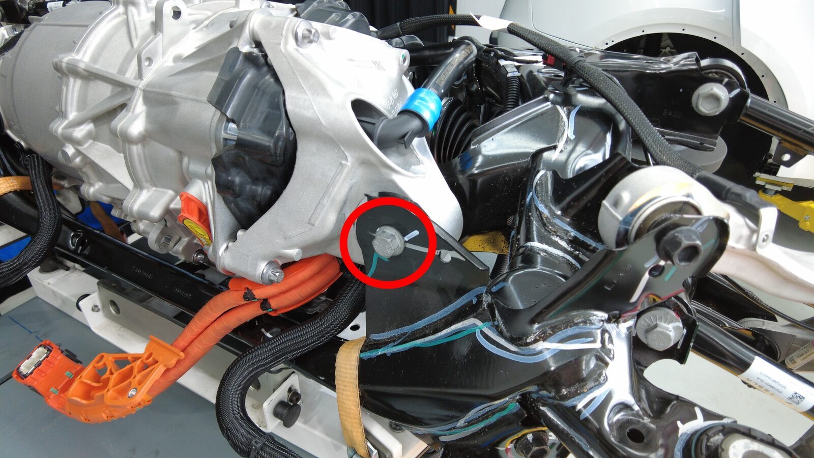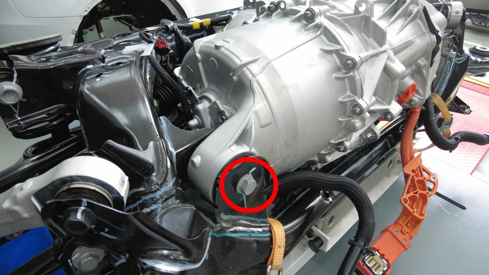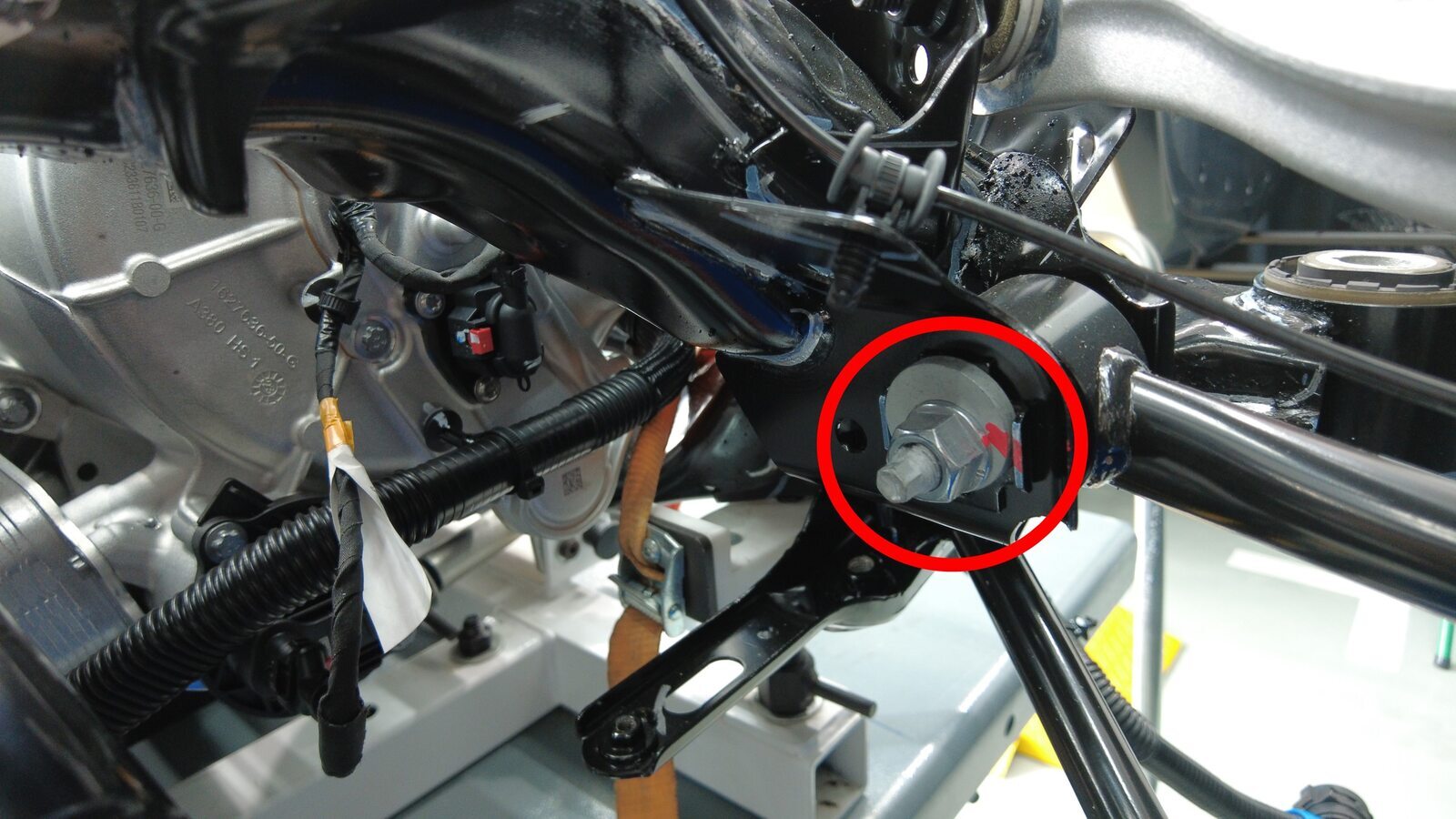 预装将左后下尾连杆固定到副车架的螺栓。