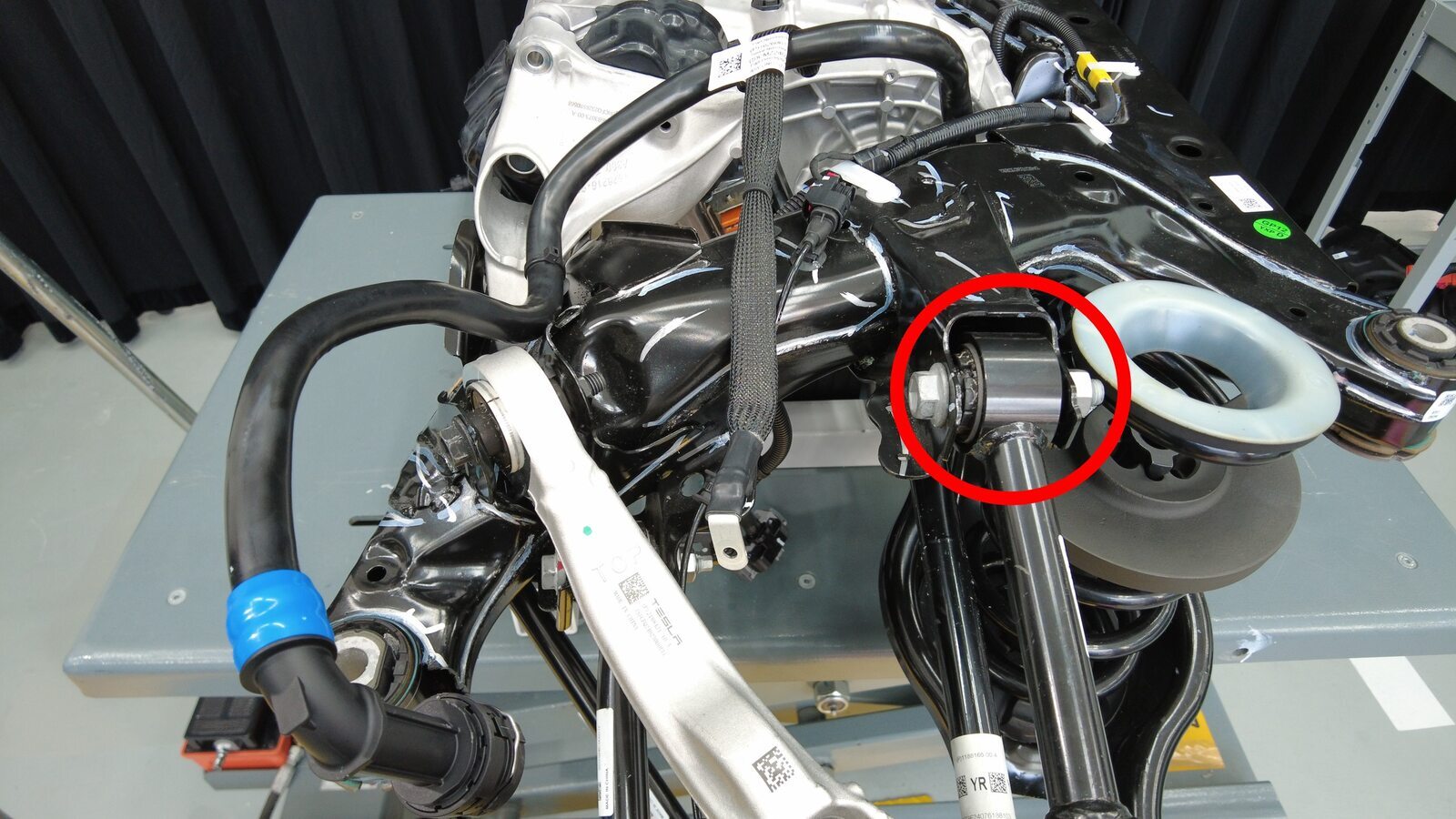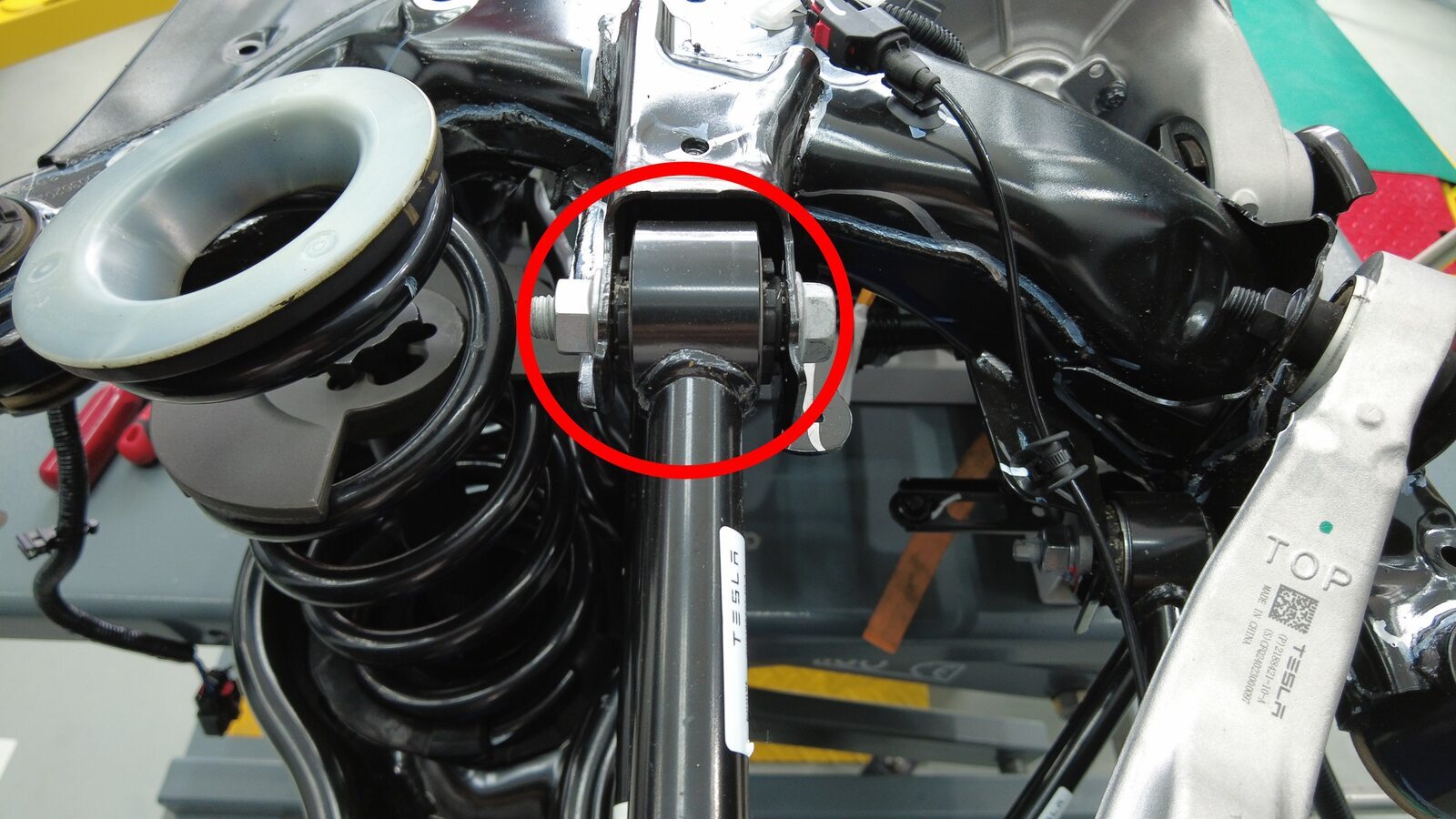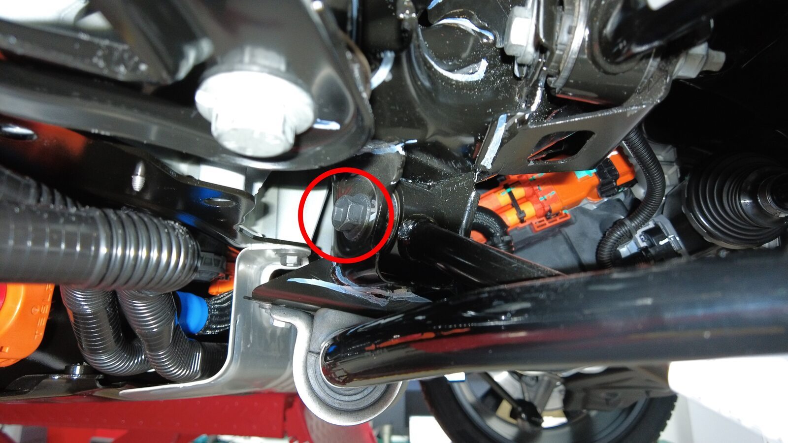 预装将左后下尾连杆固定到副车架的螺栓。