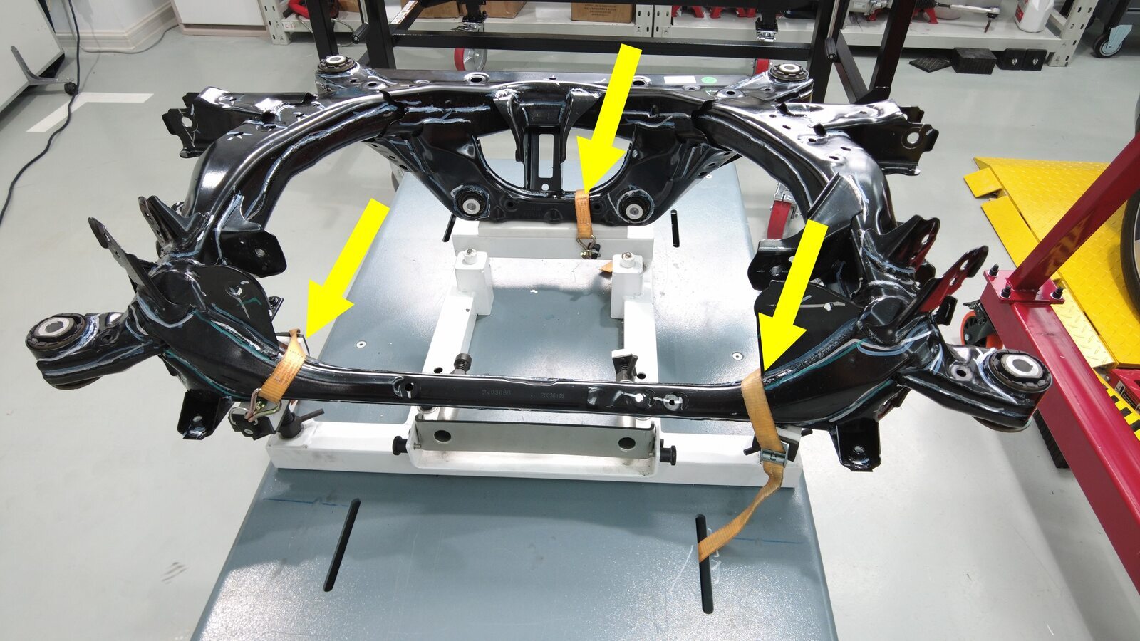 松开副车架上的系带(3 个),然后将副车架举升工具从车辆上降下。