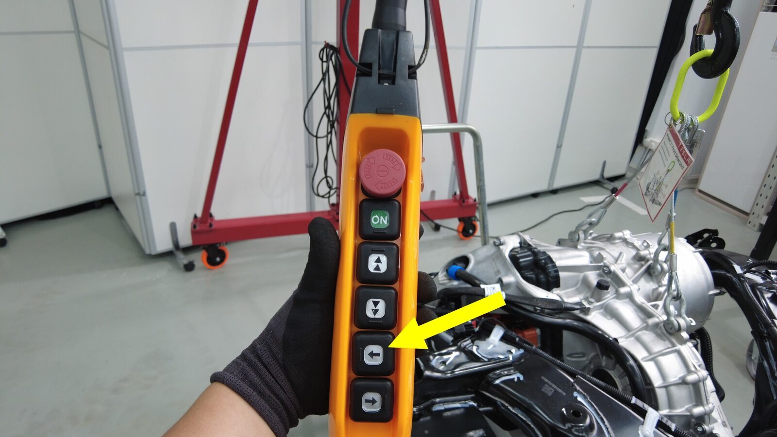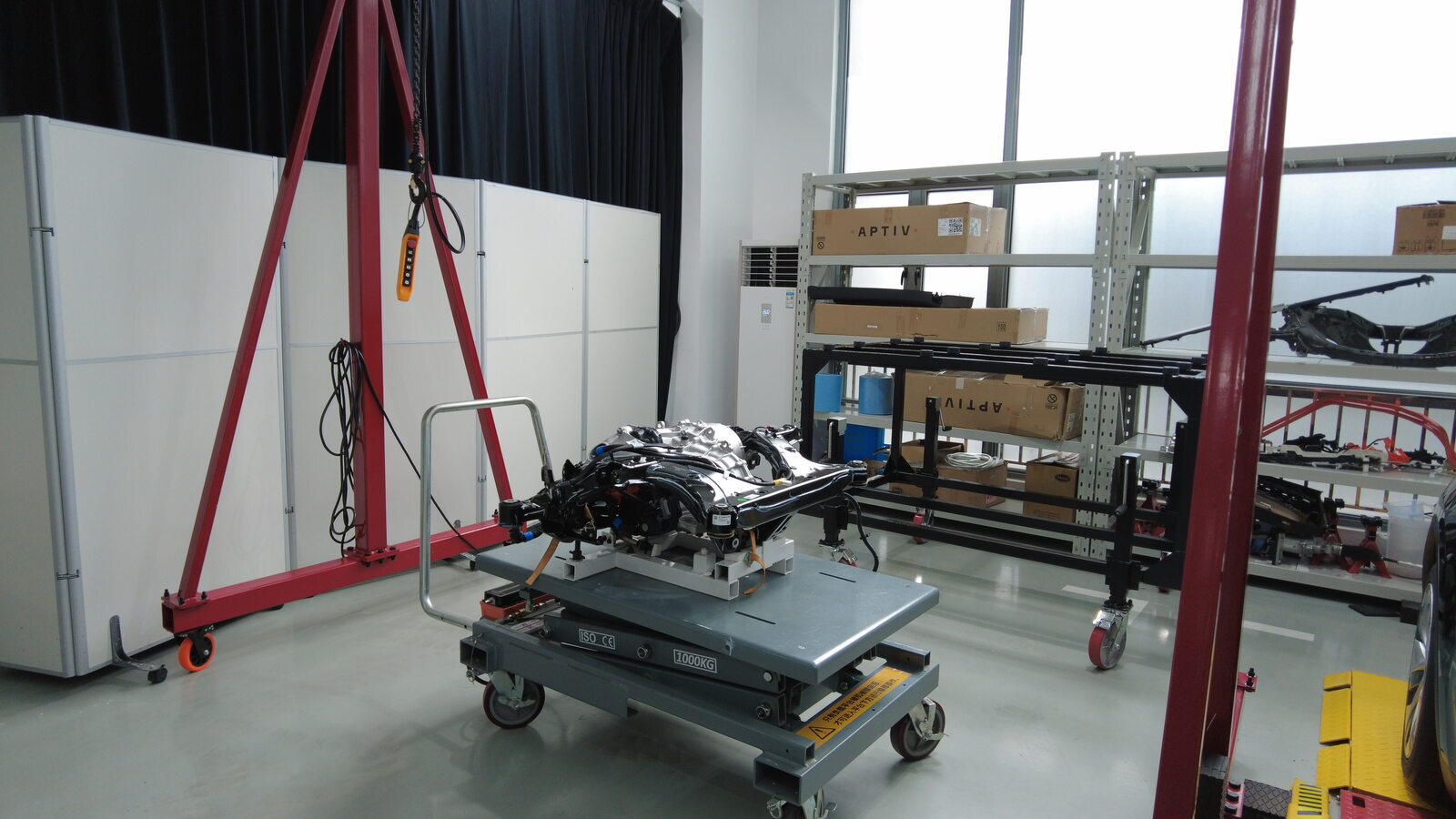 将后副车架和驱动电机总成从起重机架下方移走。
